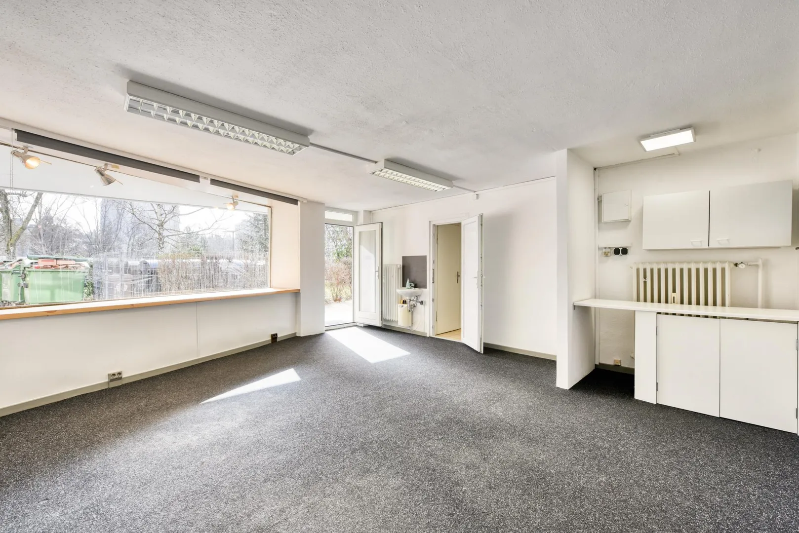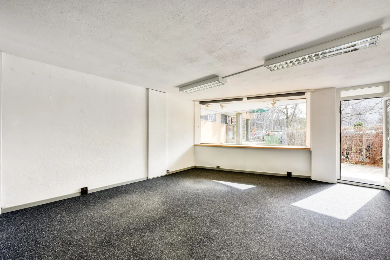 Die Schaufenster-Front ist nach Süden ausgerichtet und mit Alu-Rahmen und Innen-Rollos ausgestattet.