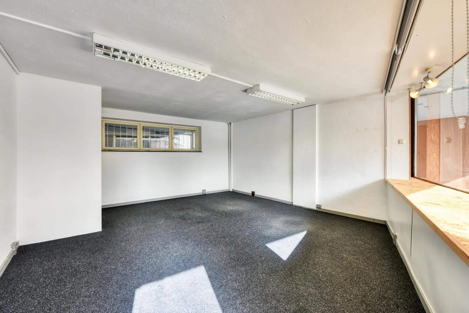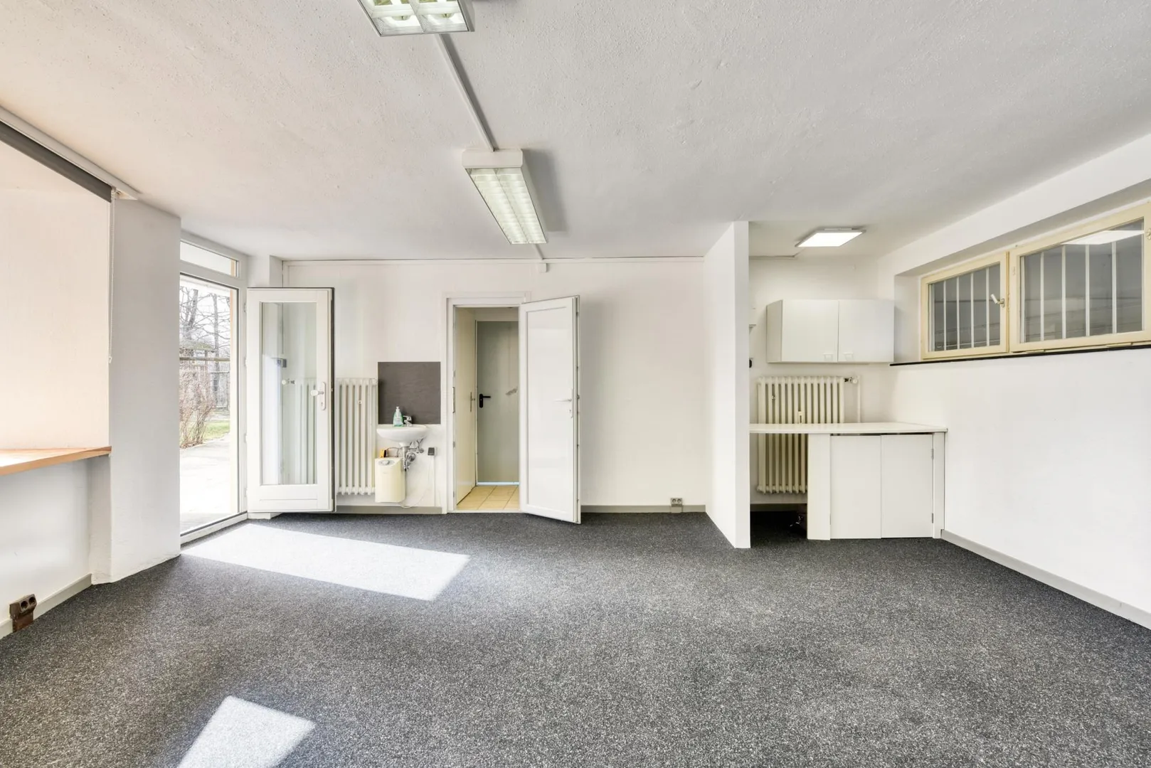 Im Raum ist ein Teppichboden verlegt. Die Wände sind mit Raufasertapeten tapeziert.