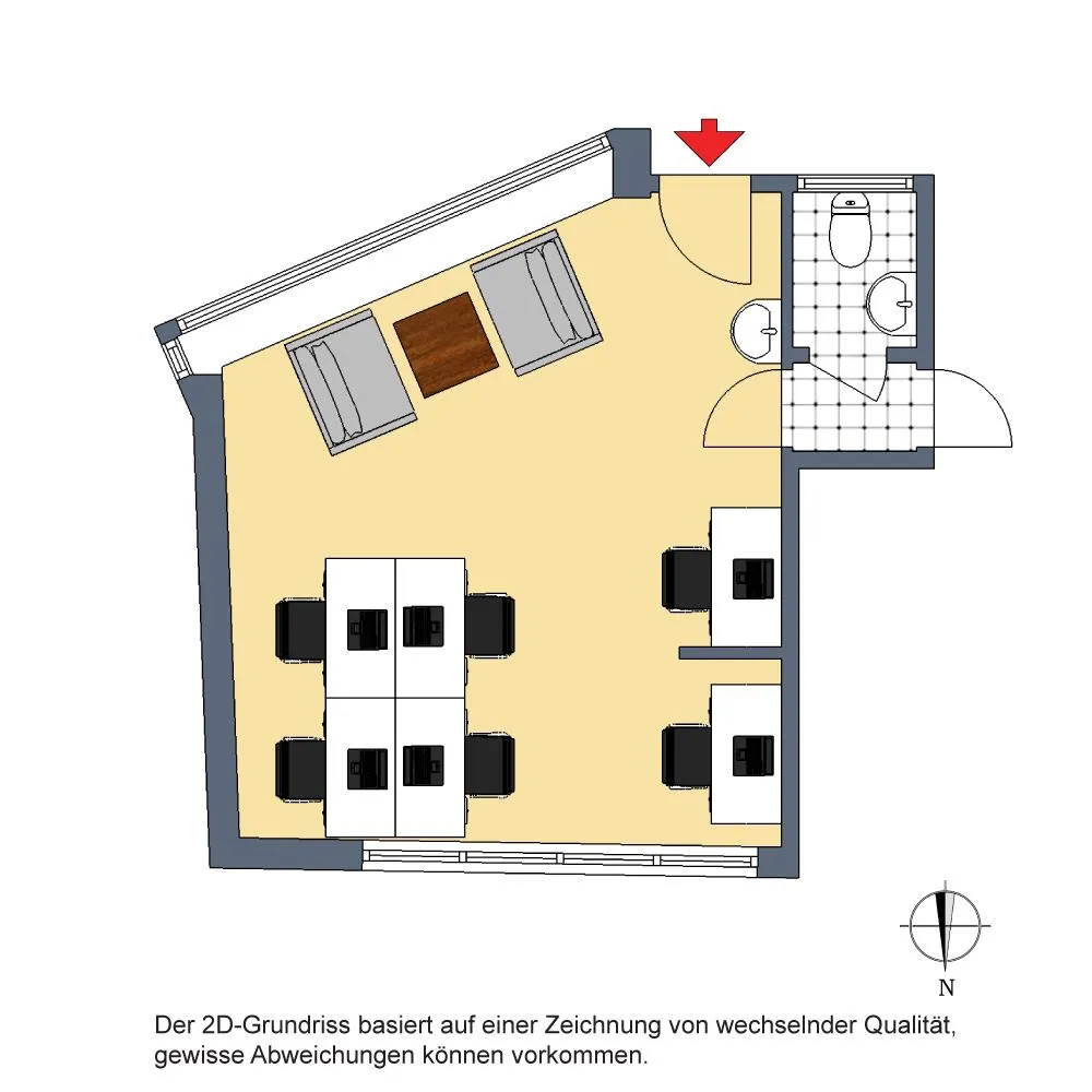 Die Gewerbeeinheit (Laden oder Büro) mit ca. 26 m² Nutzfläche besteht aus einem Raum sowie einem gemeinschaftlichen Flur sowie einem Gemeinschafts-WC mit dem Nachbar.