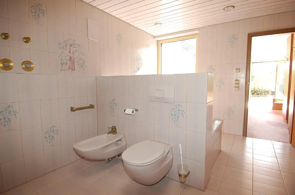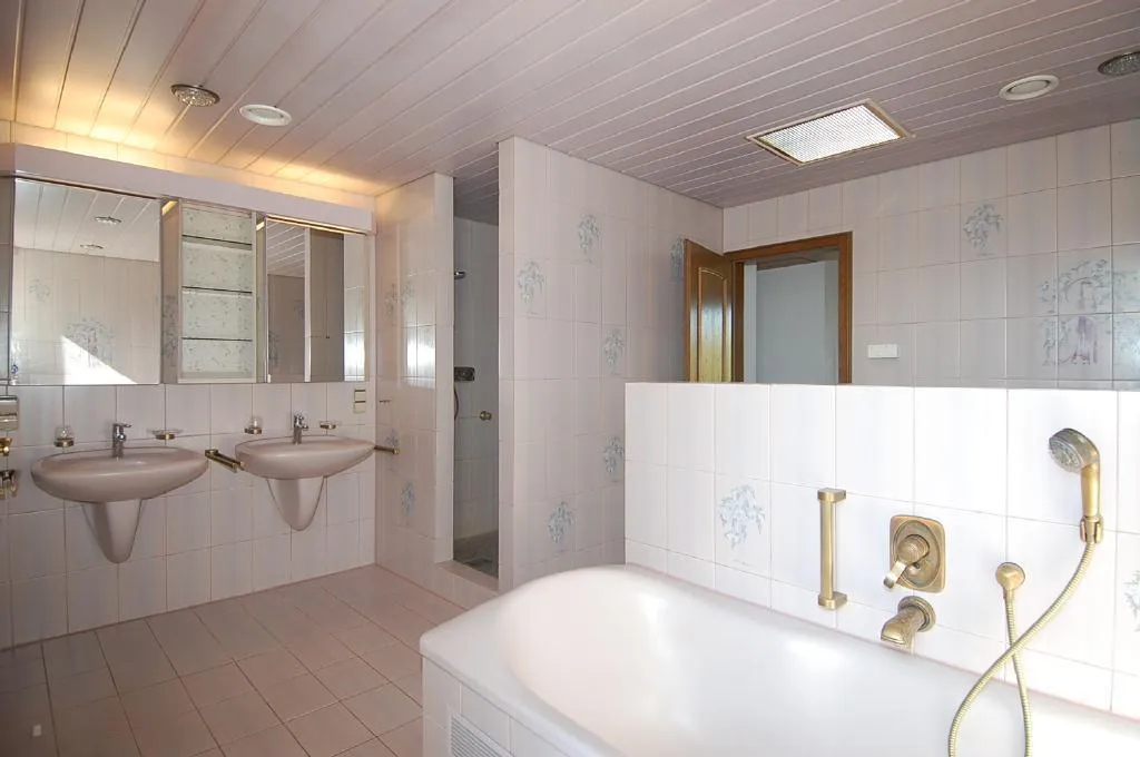Es ist ausgestattet mit einer Wanne, einer Dusche, einem WC, einem Bidet und einem Doppelwaschbecken.
