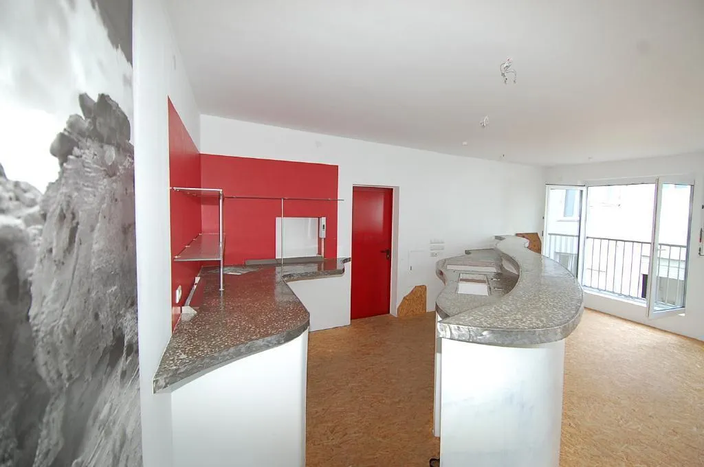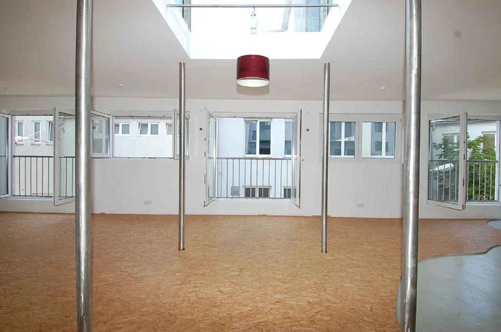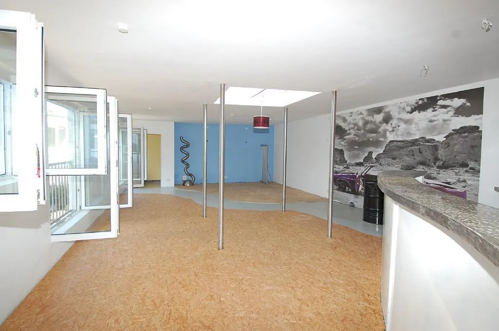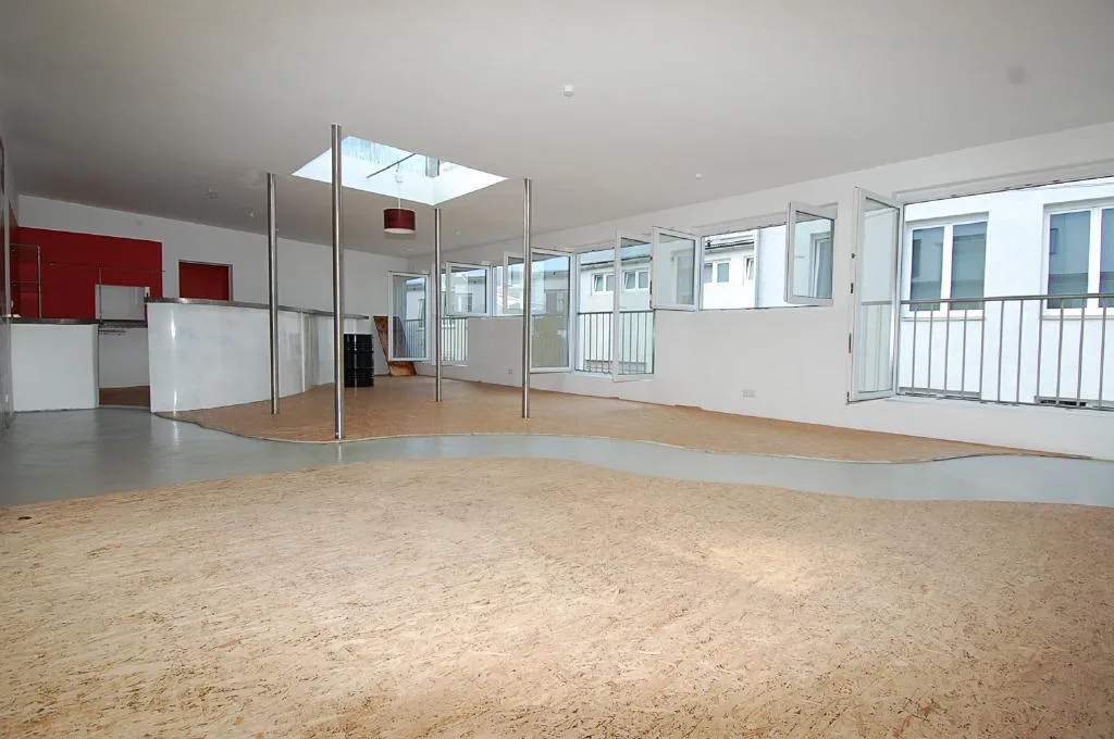 Das ca. 75 m² große Obergeschoss mit einer Raumhöhe von 2,55 m ist gestaltet als ein Raum mit Wohnbereich und offener Küche. Es ist ausgestattet mit OSB-Platten, gestrichenem Estrich und gestrichenem Platt-Putz. Es verfügt über Fenster und drei bodentiefe Fensterelemente (französische Balkone), einer ca. 4 m² großen Lichtkuppel zentral im Raum sowie zum Küchenbereich hin über eine geschwungene Theke.