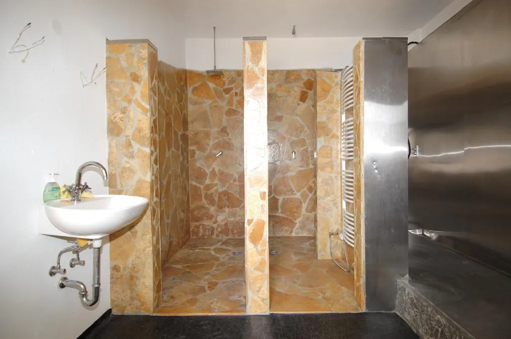 Das Badezimmer verfügt über zwei mit Naturstein geflieste und bodenebene Duschen, ein WC und ein Fenster.
