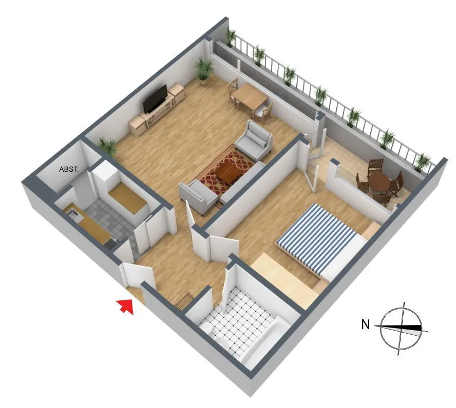 Der Grundriss der Wohnung ist gut. Alle Räume sind vom Flur begehbar. Der überdachte, ca. 9 m² große Ost-Süd-Balkon mit zwei Markisen ist von beiden Zimmern zugängig. An der Küche gibt es eine Speisekammer.