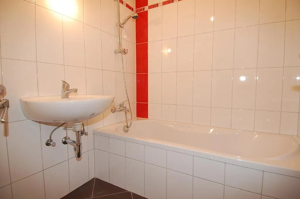 Das Badezimmer verfügt über einen neuen Fliesenboden, neue Wandfliesen (raumhoch), einer neuen Badewanne und einem neuen Waschbecken.