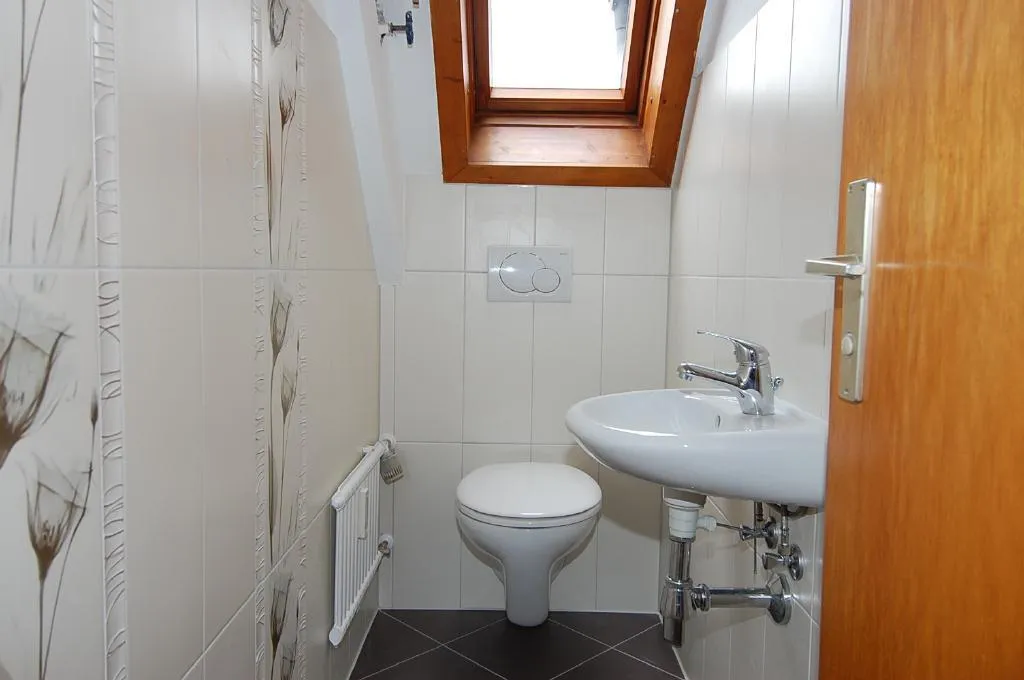 Das WC verfügt über neue Sanitärausstattung, ist neu gefliest und hat ein Holz-Dachflächen-Fenster.