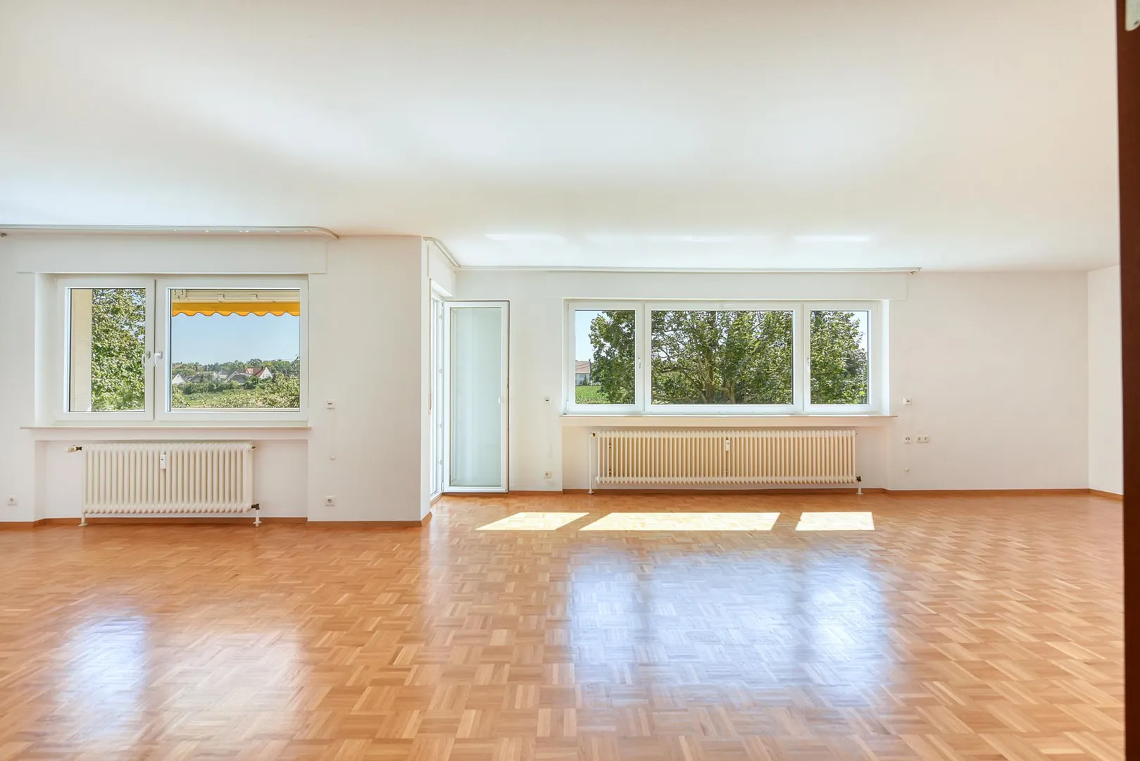Im Wohn-/Esszimmer ist ein Parkettboden verlegt.