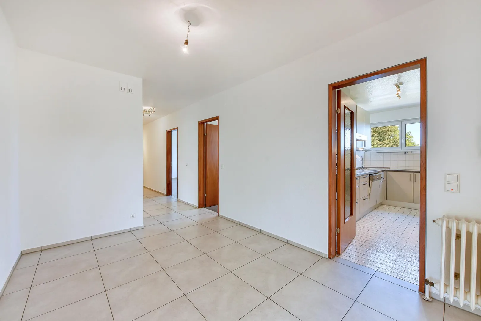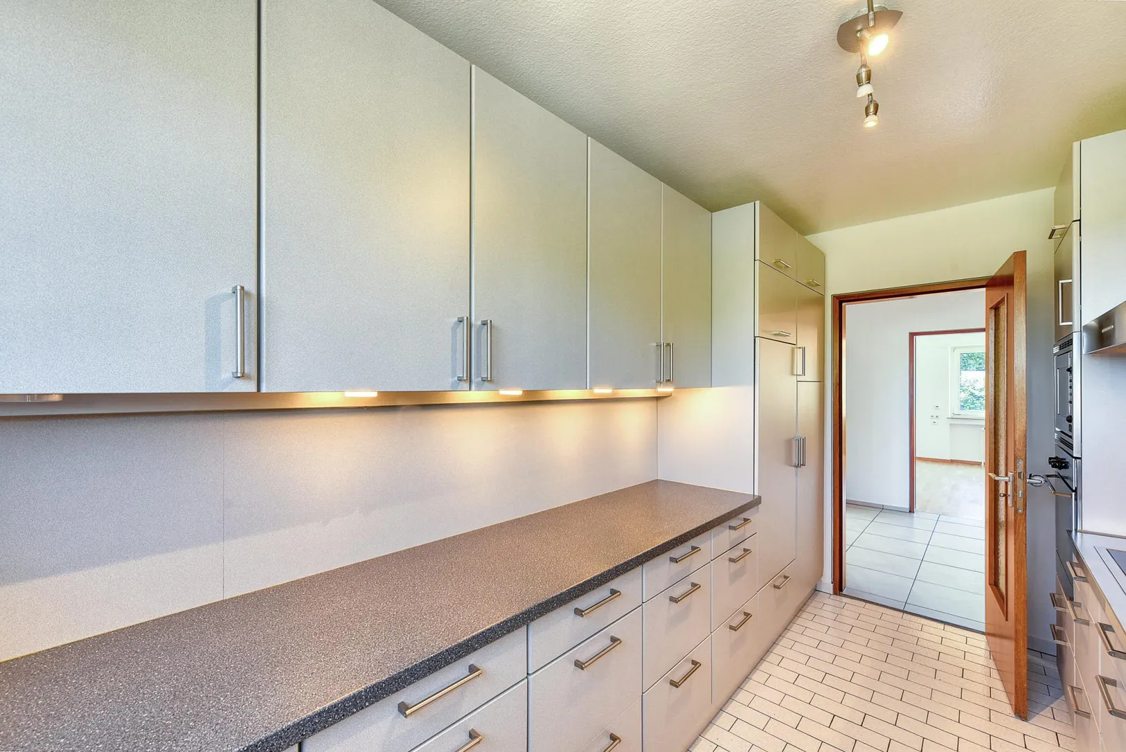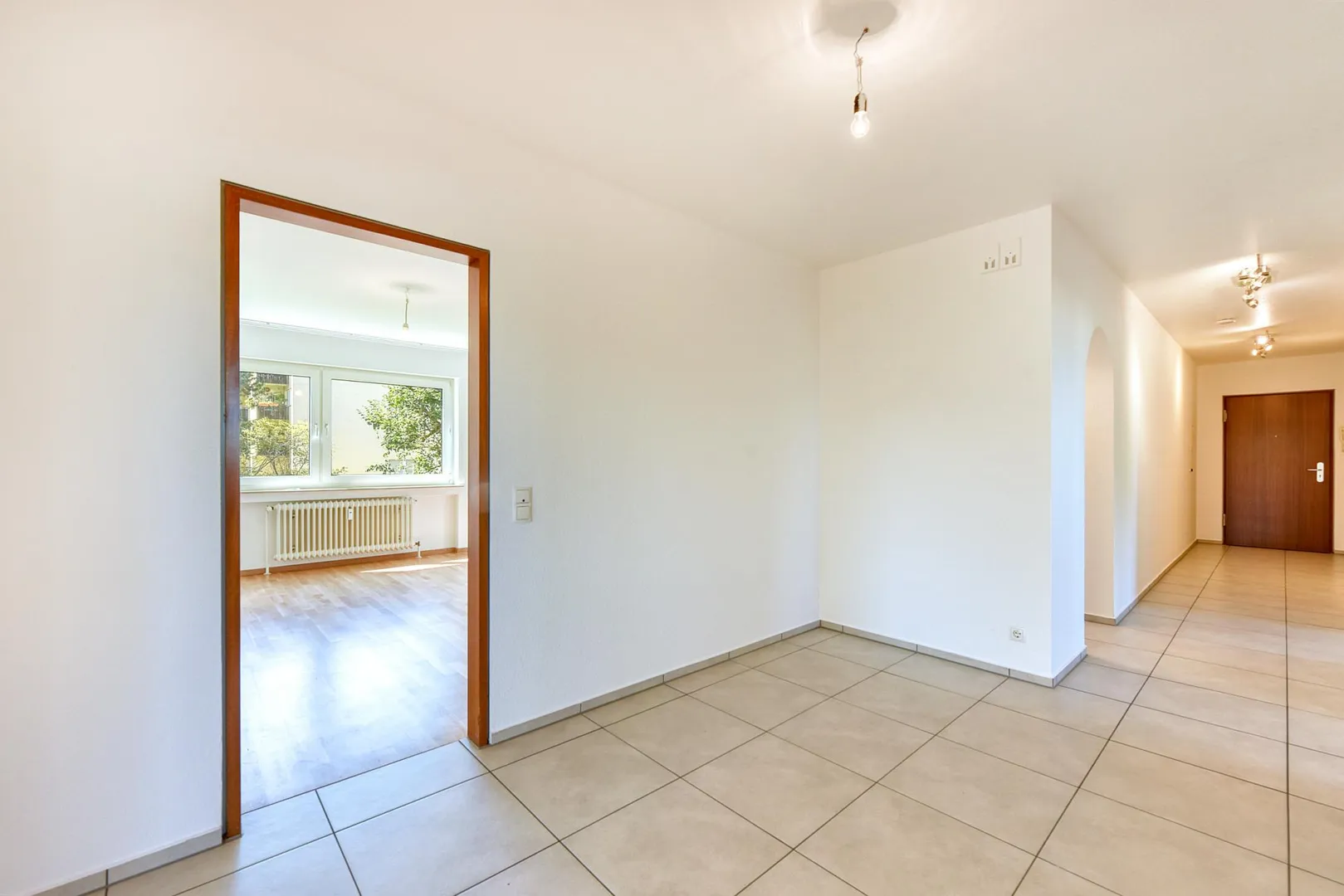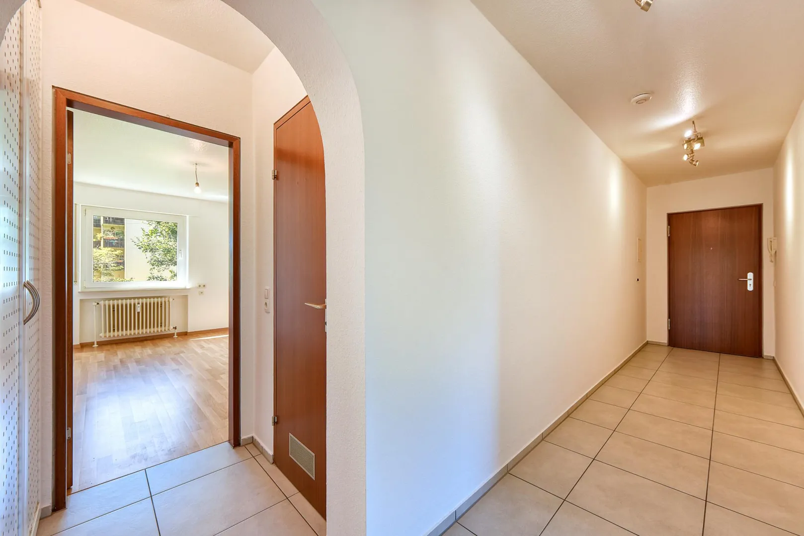 Der Flur ist ausgestattet mit einem Fliesenboden sowie einem Einbauschrank.