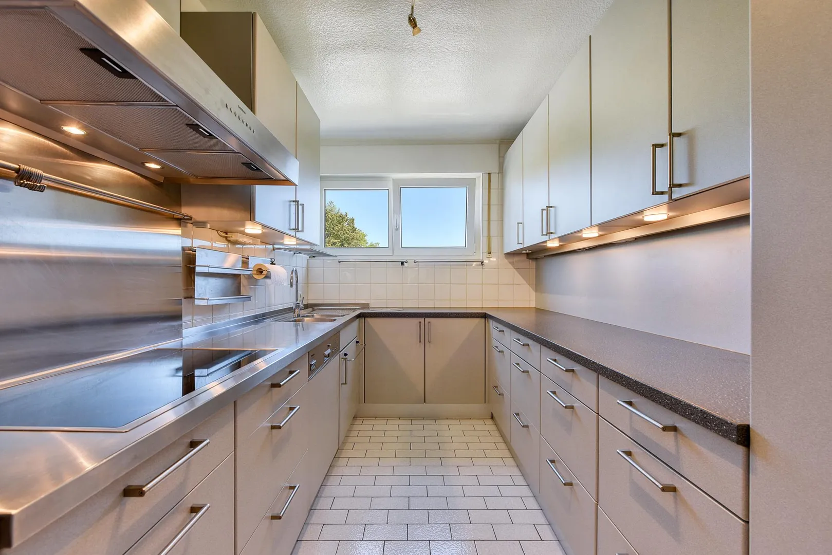 Die Küche ist ausgestatte mit einem Fliesenboden sowie einer Einbauküche. Die Elektrogeräte sind funktionsfähig. Für die künftige Funktionsfähigkeit der E-Geräte übernimmt der Vermieter keine Haftung.