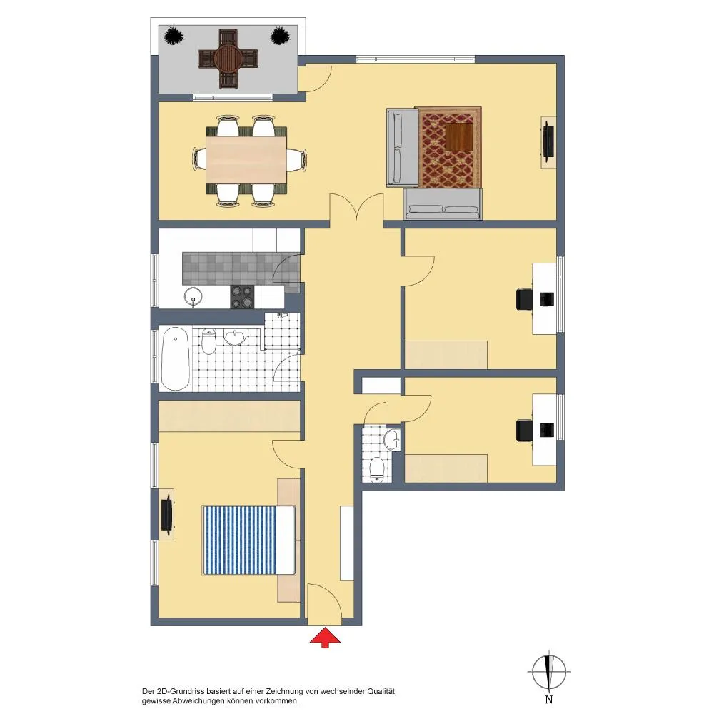 Der Grundriss ist sehr gut: alle Räume sind direkt vom Flur begehbar. Das Badezimmer verfügt über ein Fenster. Das Gäste-WC ist innenliegend. Der ca. 8 m² große und überdachte Balkon ist über das Wohnzimmer begehbar.
