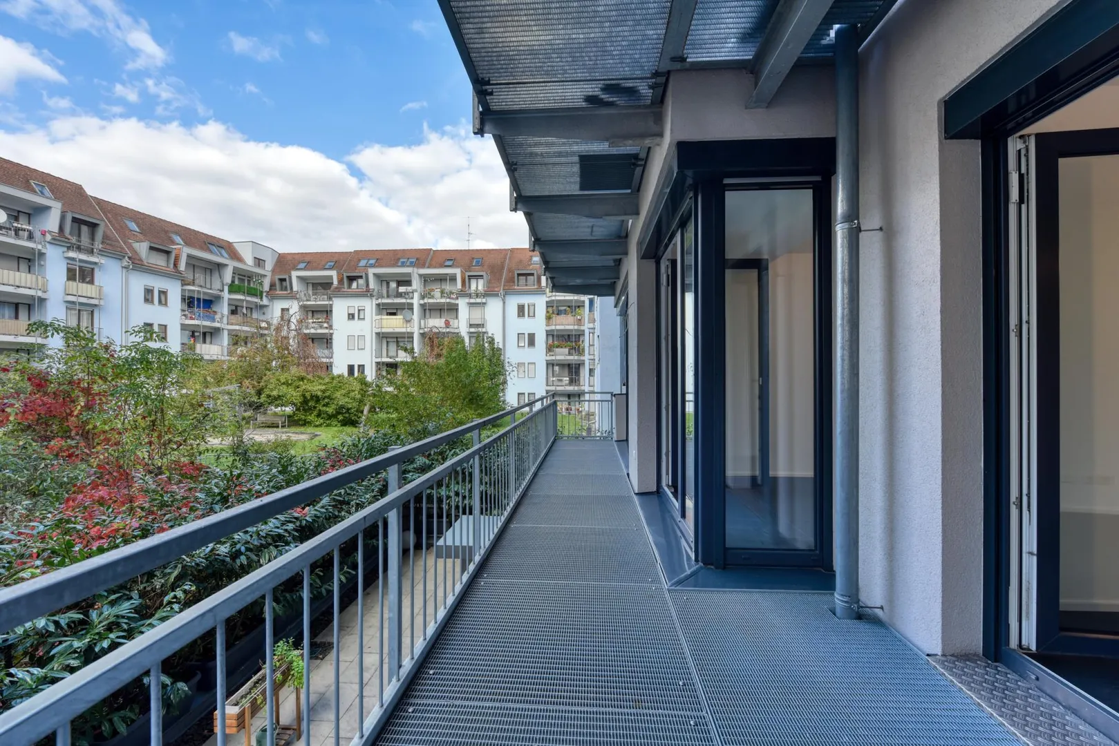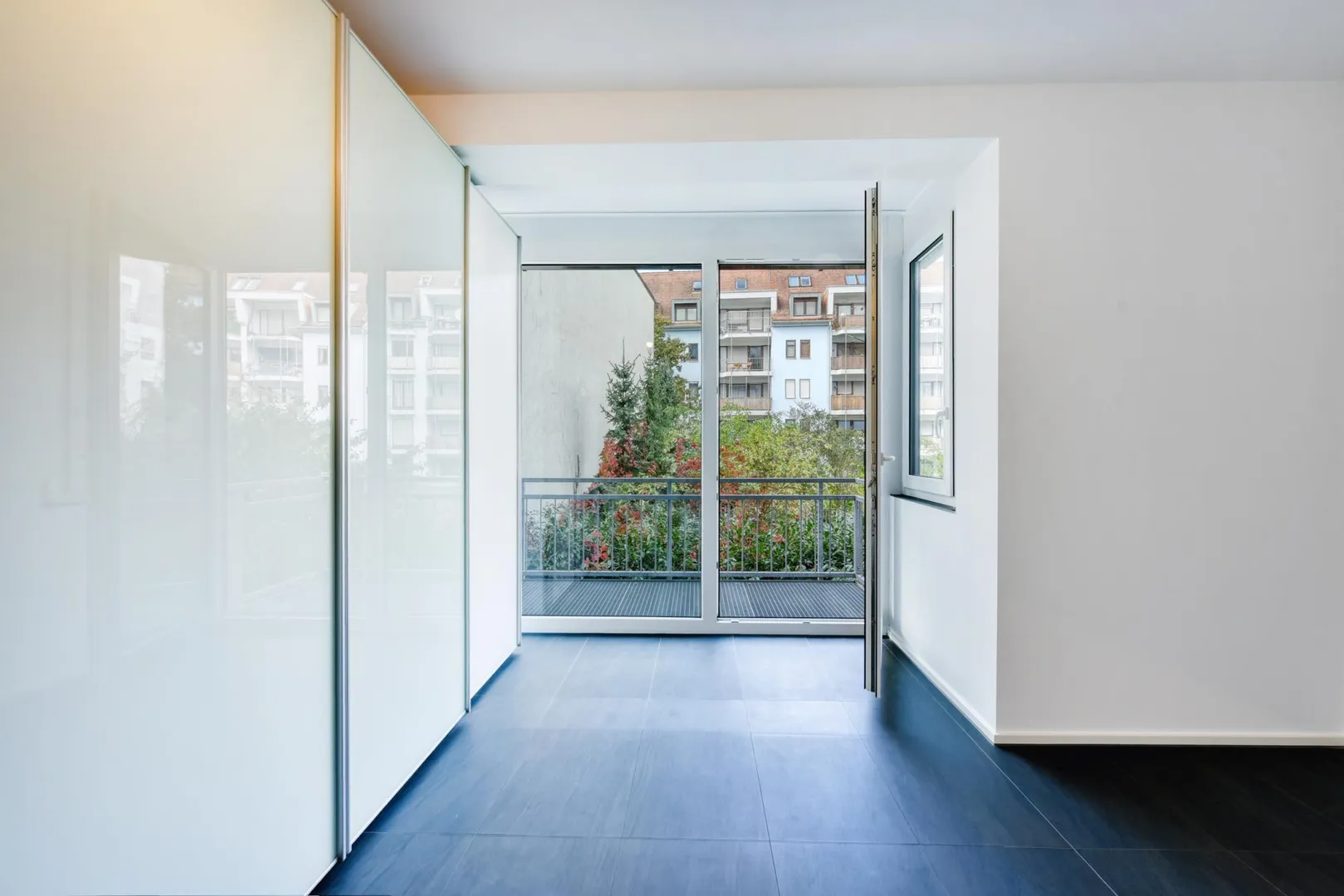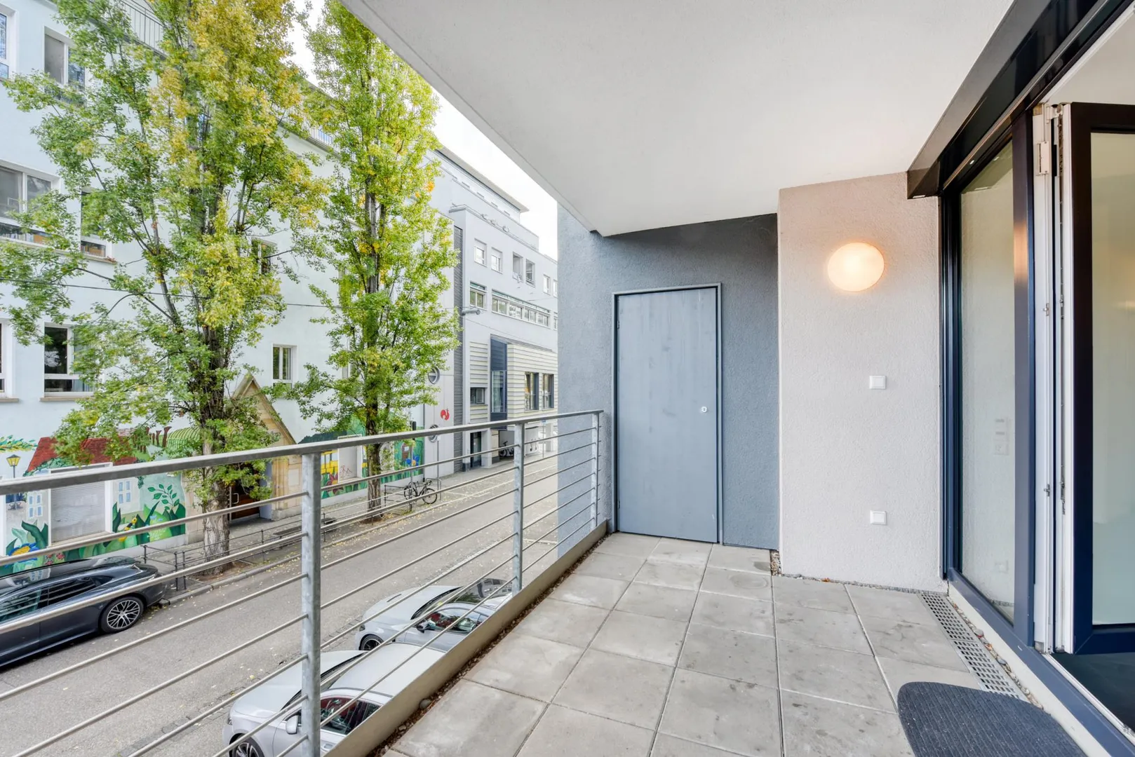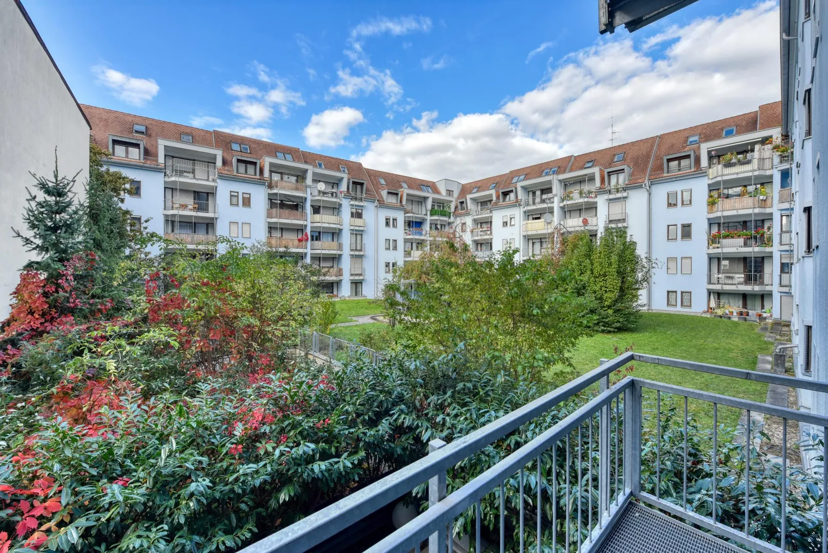Der Wohnbereich mit dem Balkon ist nach Süd-Osten, zur Straße ausgerichtet. Die anderen drei Zimmer mit dem Balkon sind nach Nord-West, Richtung Innenhof ausgerichtet.