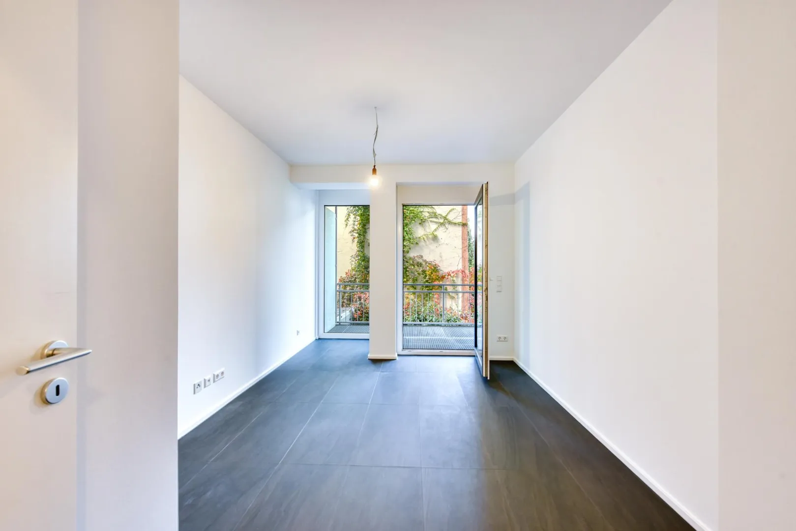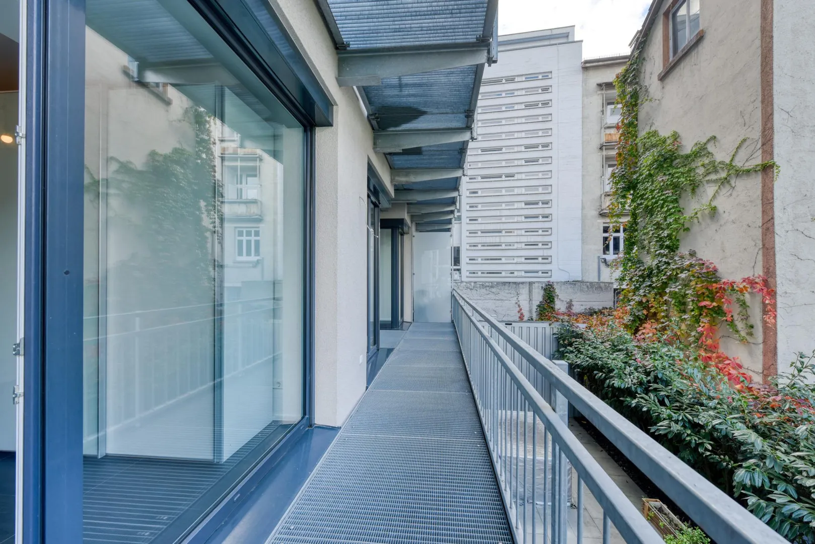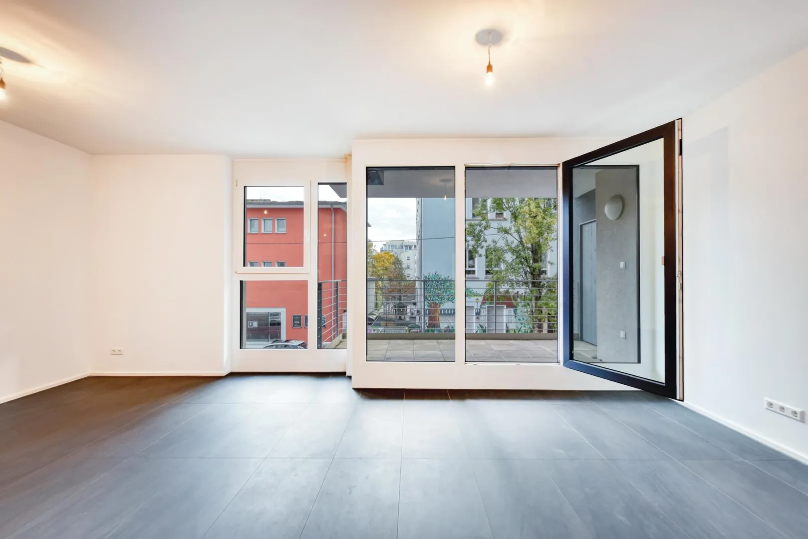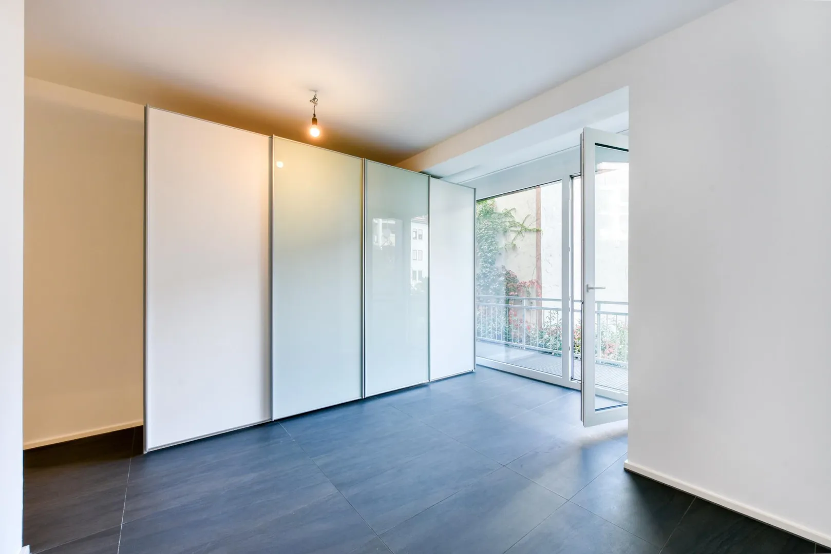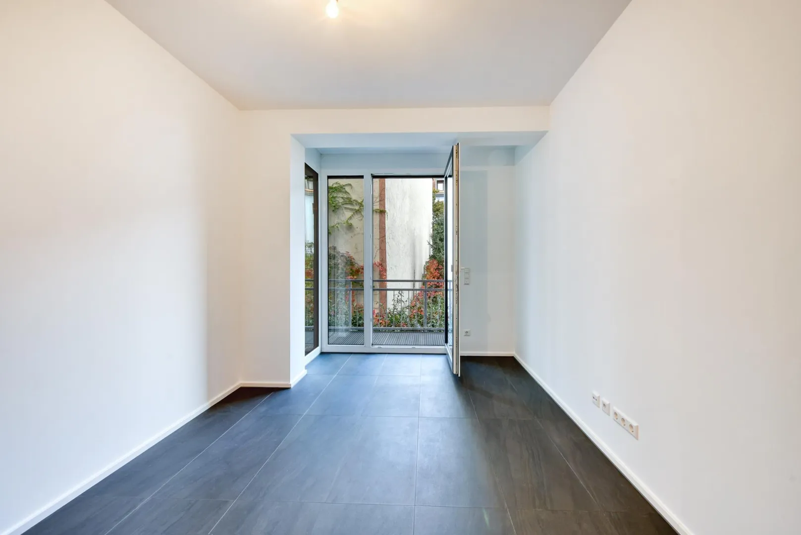Der Wohnbereich mit dem Balkon ist nach Süd-Osten, zur Straße ausgerichtet. Die anderen drei Zimmer mit dem Balkon sind nach Nord-West, Richtung Innenhof ausgerichtet.