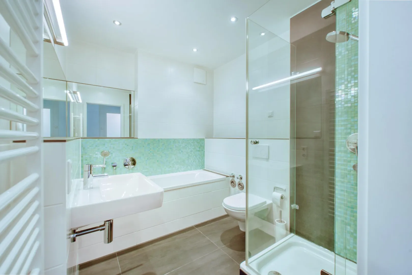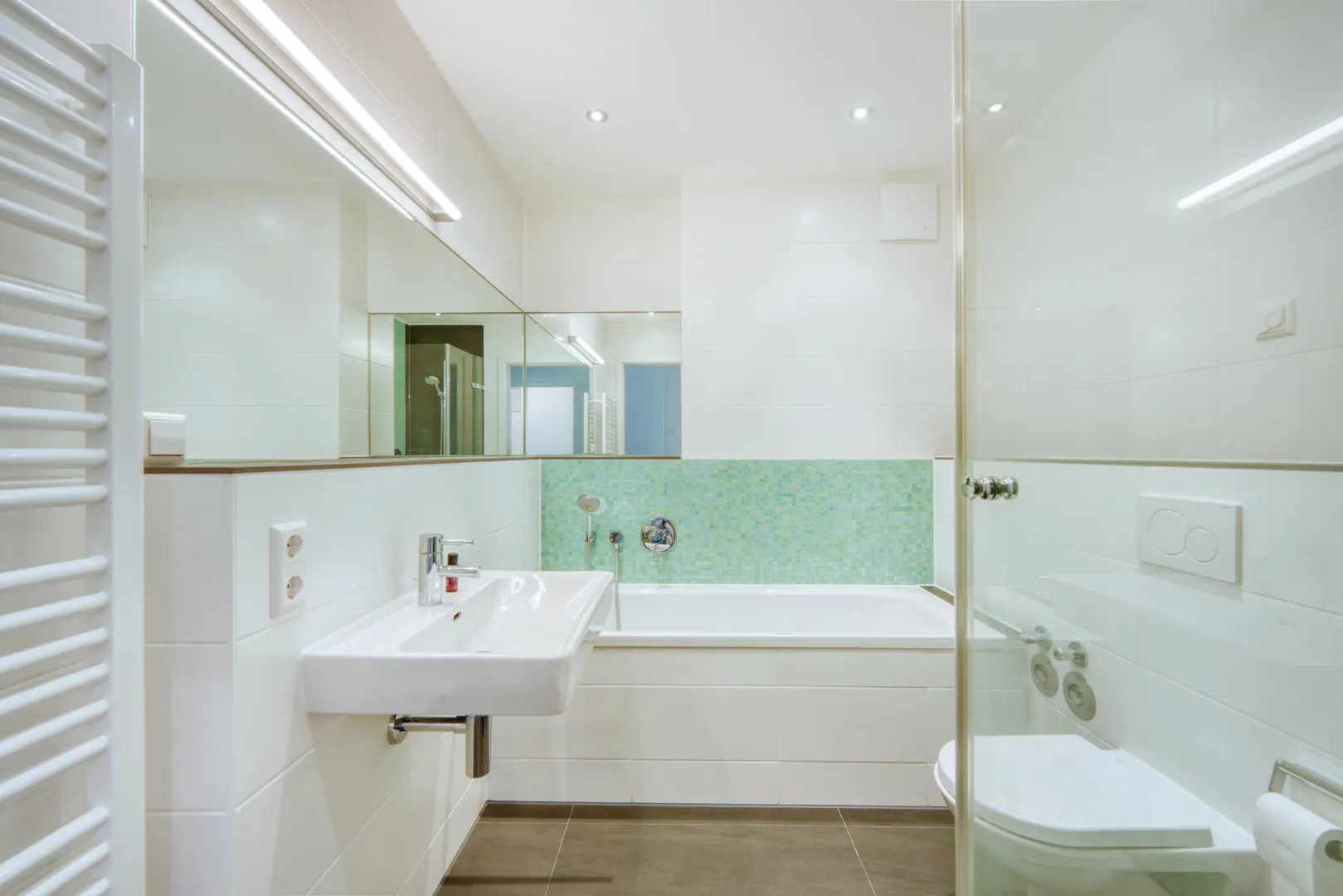 Das raumhoch geflieste Badezimmer ist ausgestattet mit einer Badewanne, einer Dusche, einem WC, einem Handtuch-Heizkörper, einem Spiegel mit Beleuchtung sowie abgehängter Decke mit LED-Leuchten.