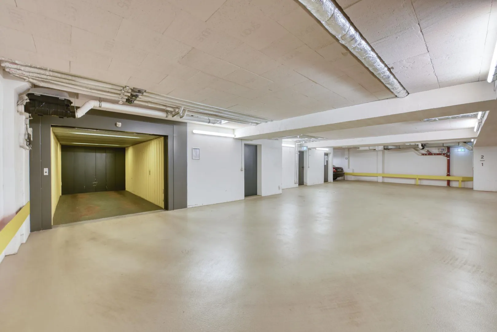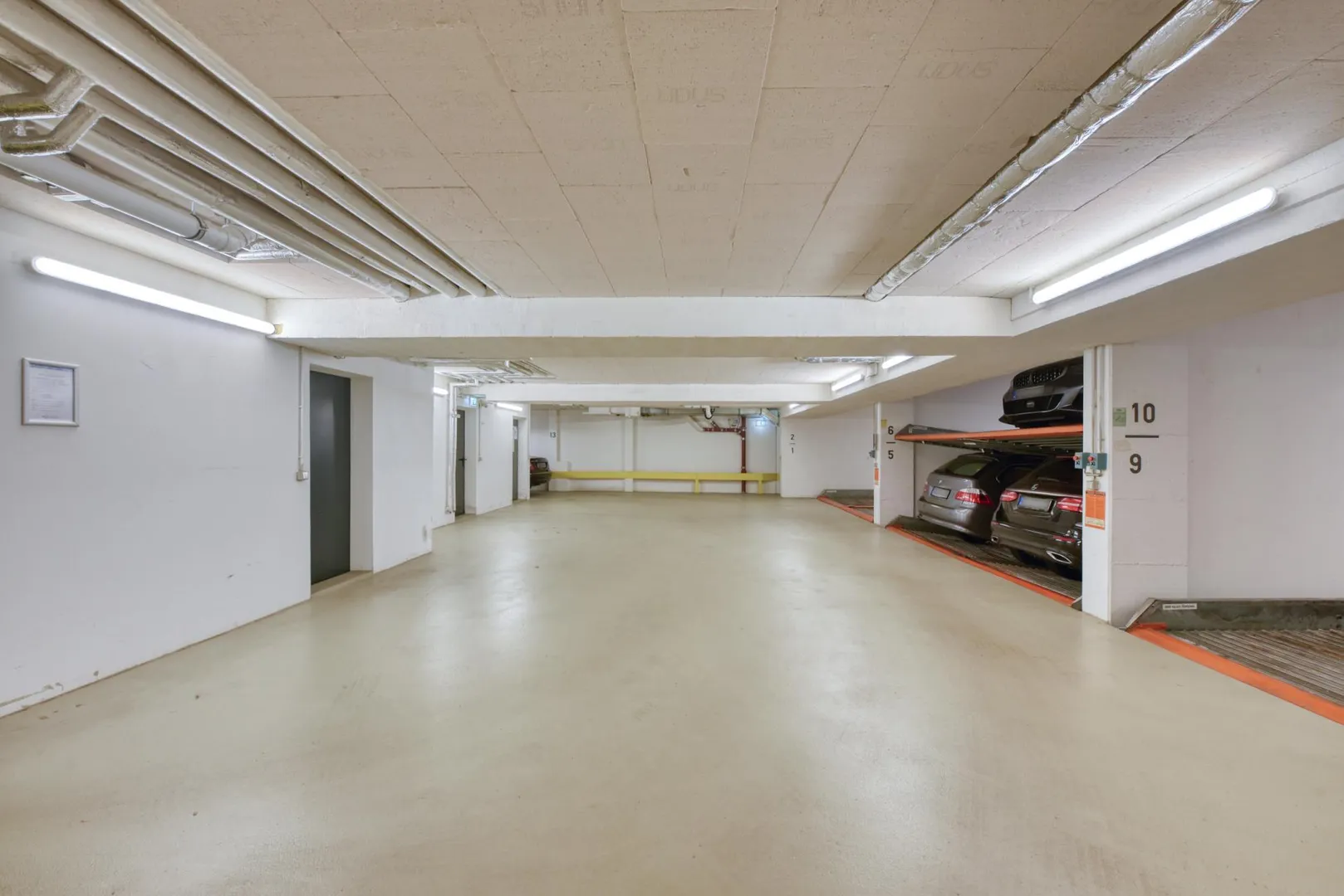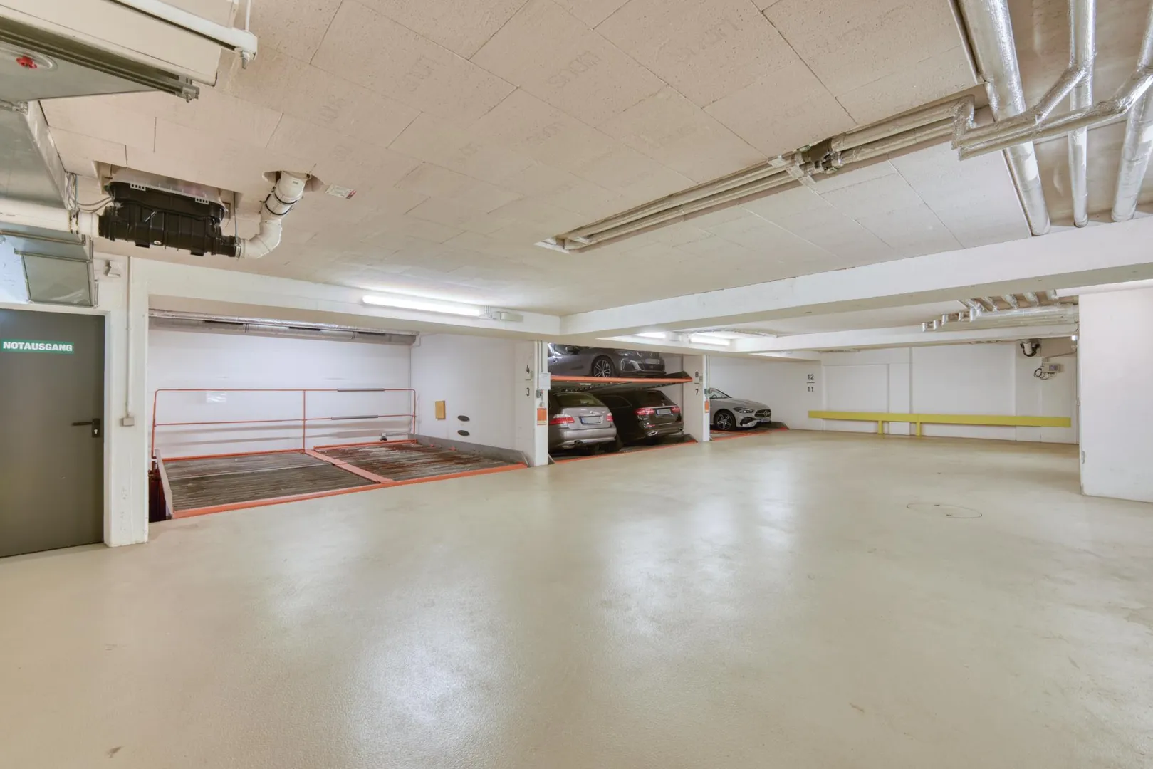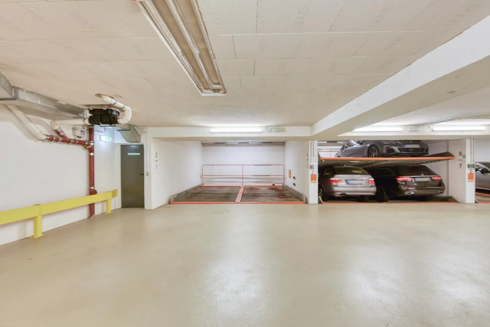 Zur Wohnung gehören ein Abstellraum im Erdgeschoss sowie ein Kfz-Stellplätze im Doppelparker (Duplex, oben), welcher mit 150 EUR monatlich in der Angabe der Kaltmiete bereits enthalten ist.
