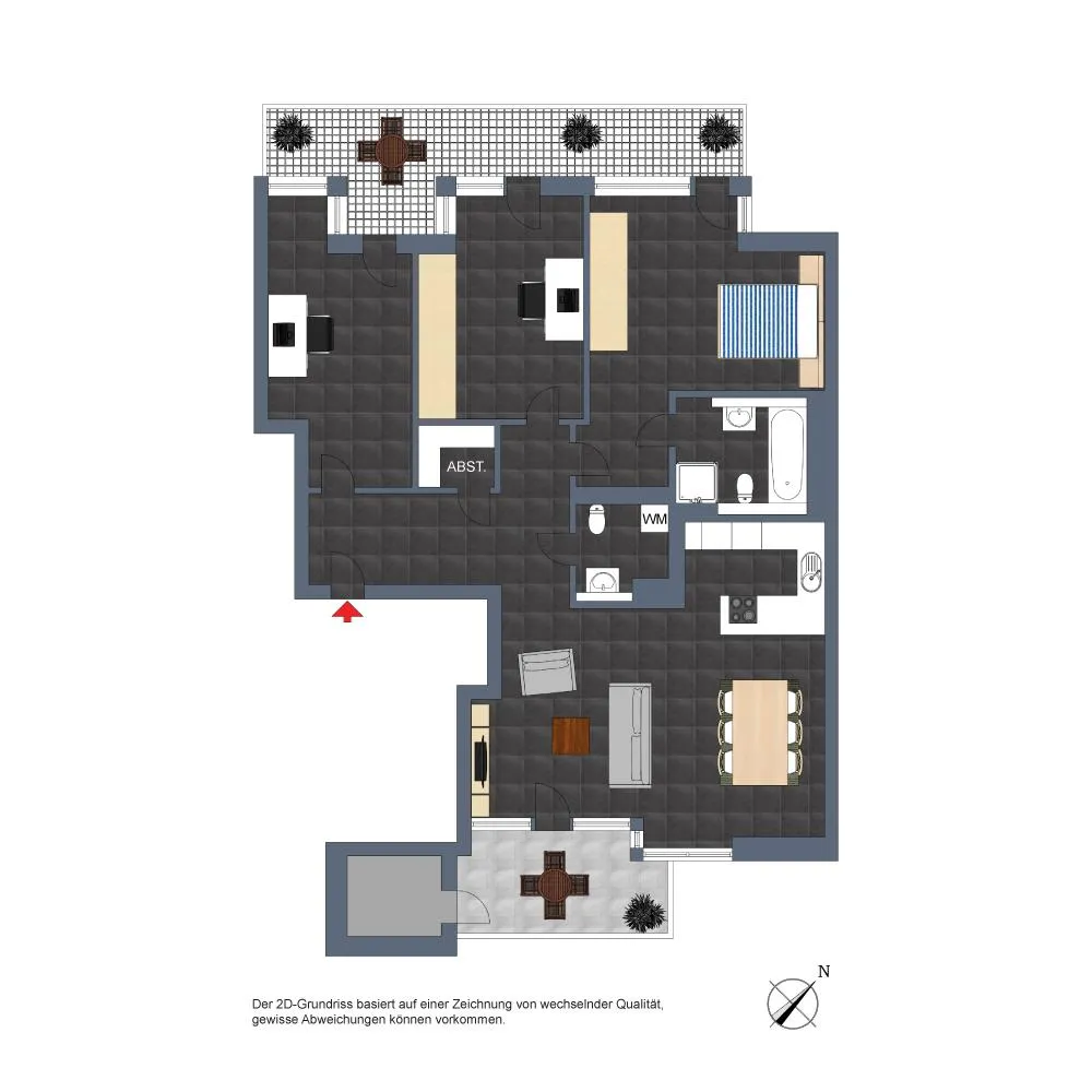 Der überdachte Süd/Ost-Balkon ist ca. 8 m² groß. Der überdachte Nord/West-Balkon ist ca. 14 m² groß.