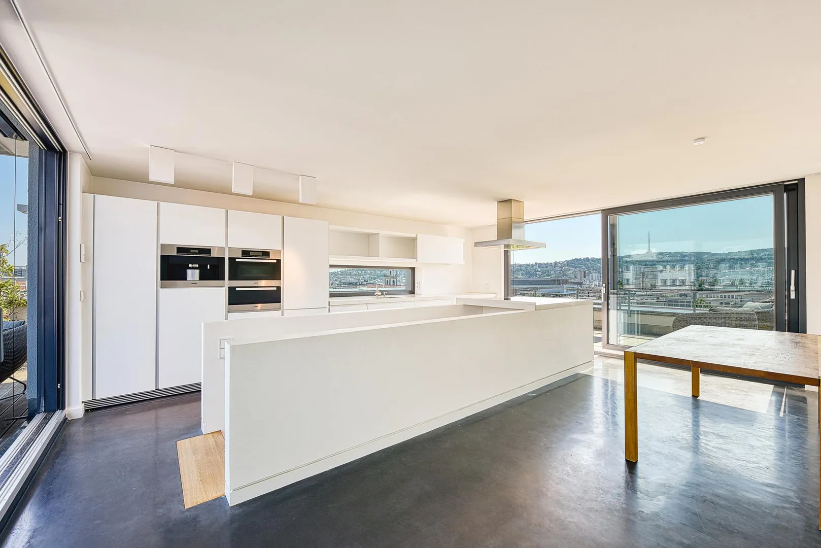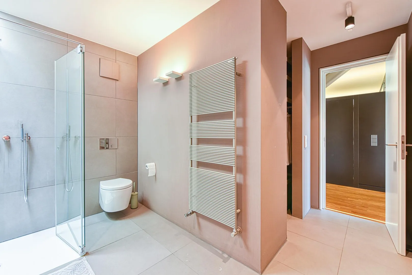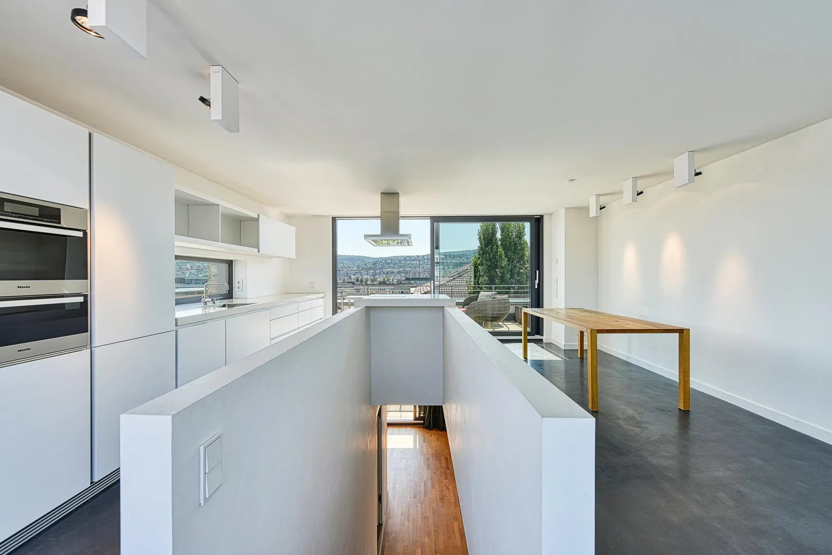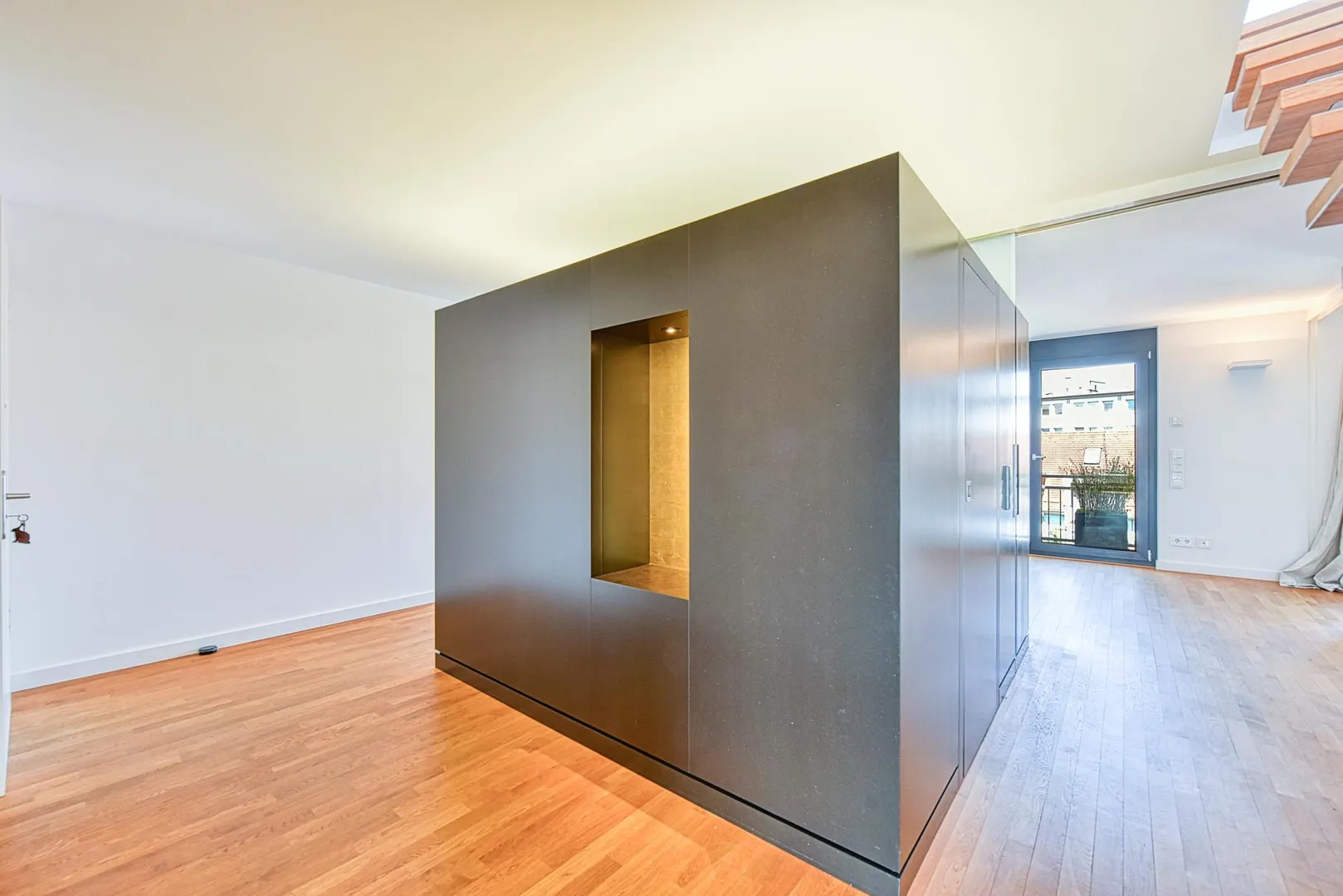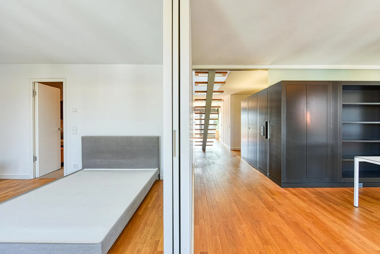 Die Zimmertüren sind als Schiebetüren-Elemente ausgeführt, welche in den Wänden verschwinden, sodass eine loftartige Wirkung erzielt wird.