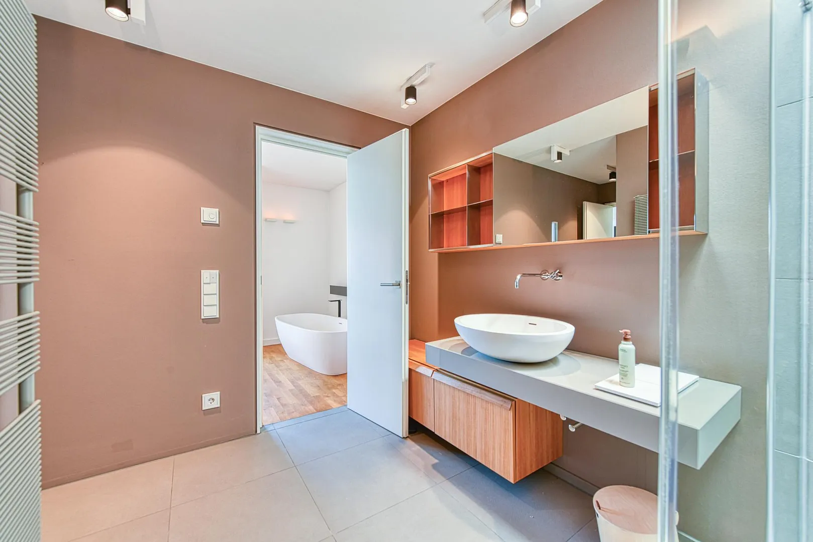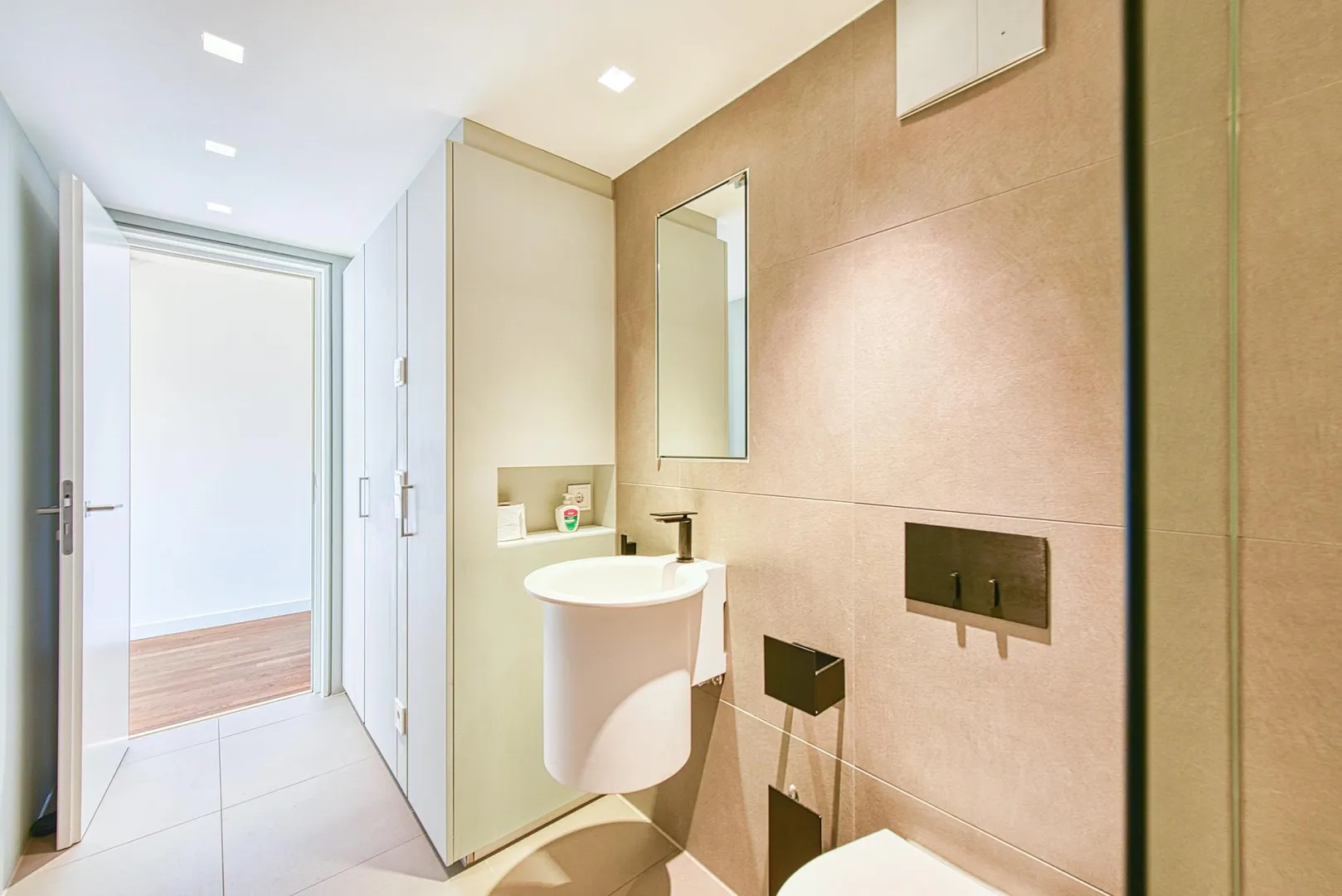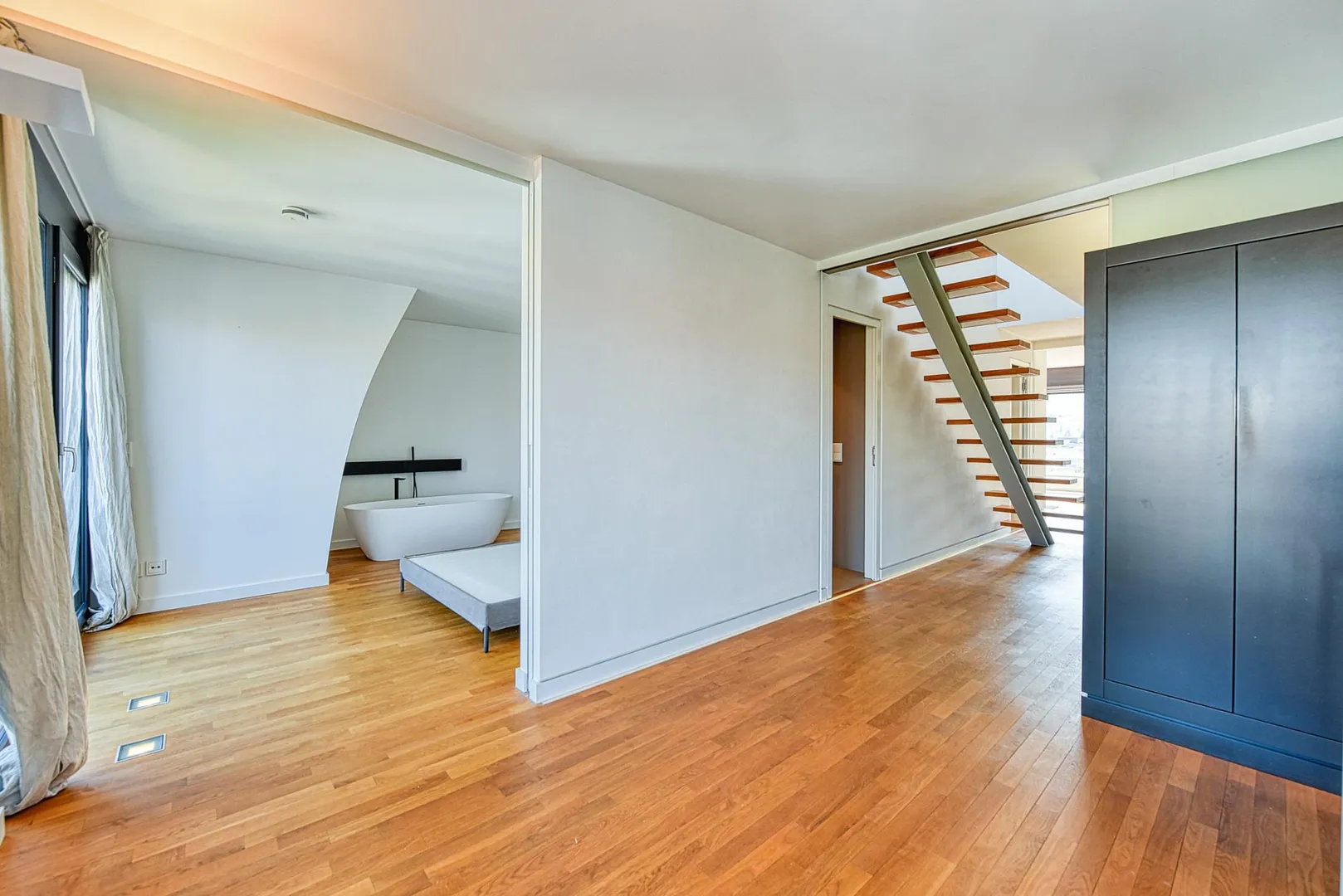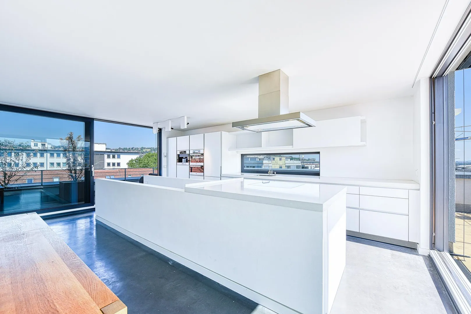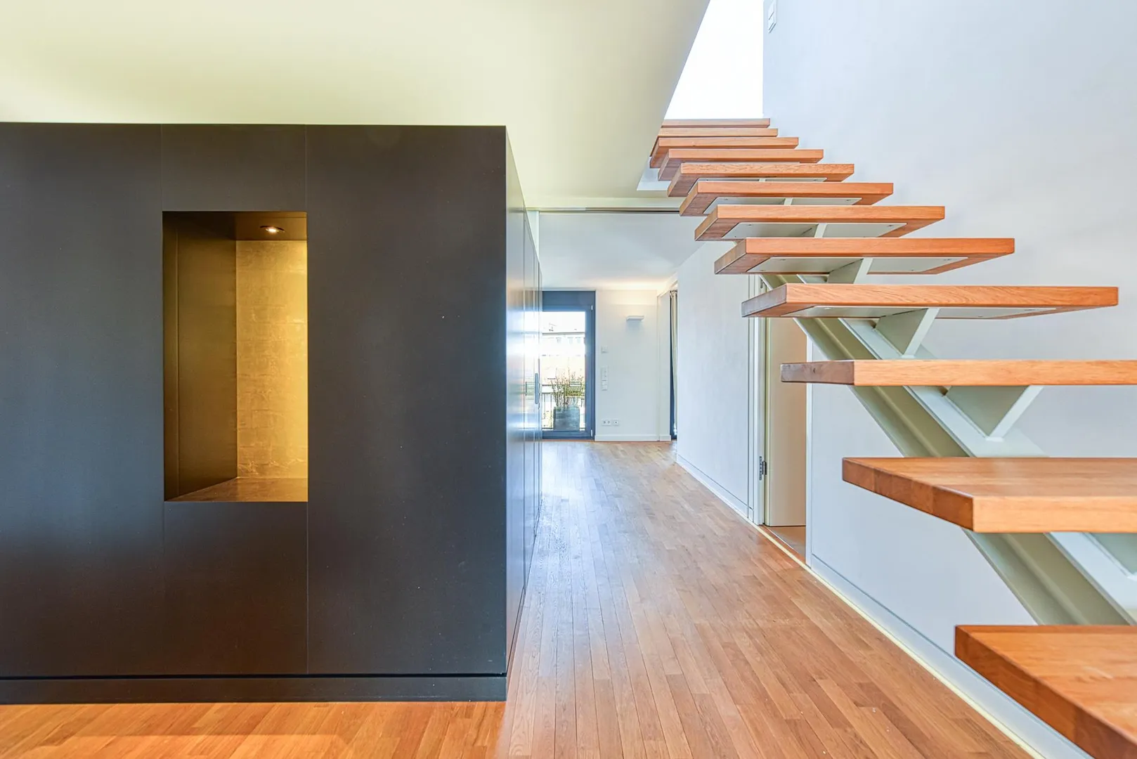 Die Zimmertüren sind als Schiebetüren-Elemente ausgeführt, welche in den Wänden verschwinden, sodass eine loftartige Wirkung erzielt wird.