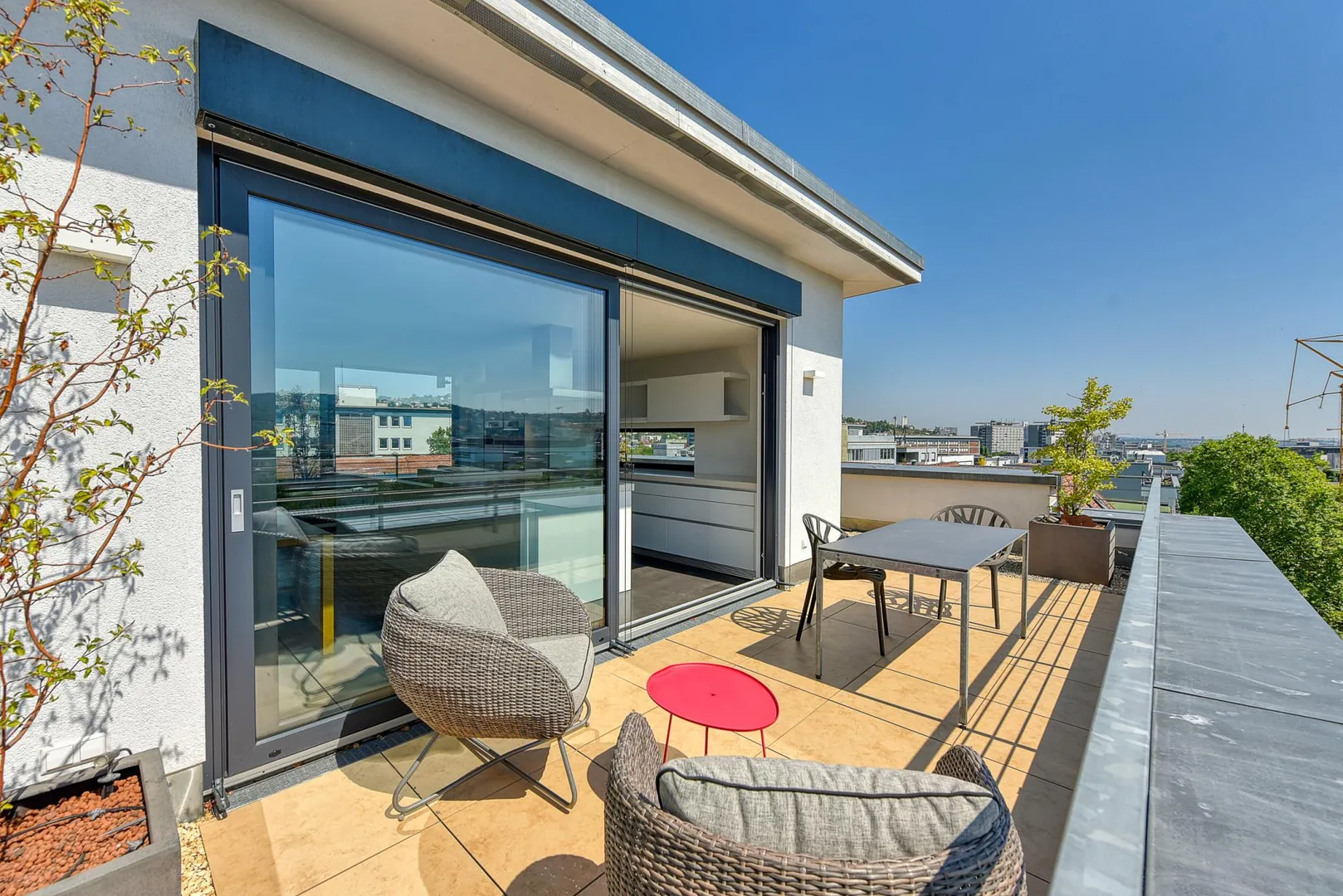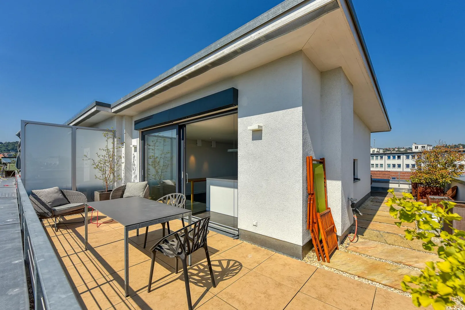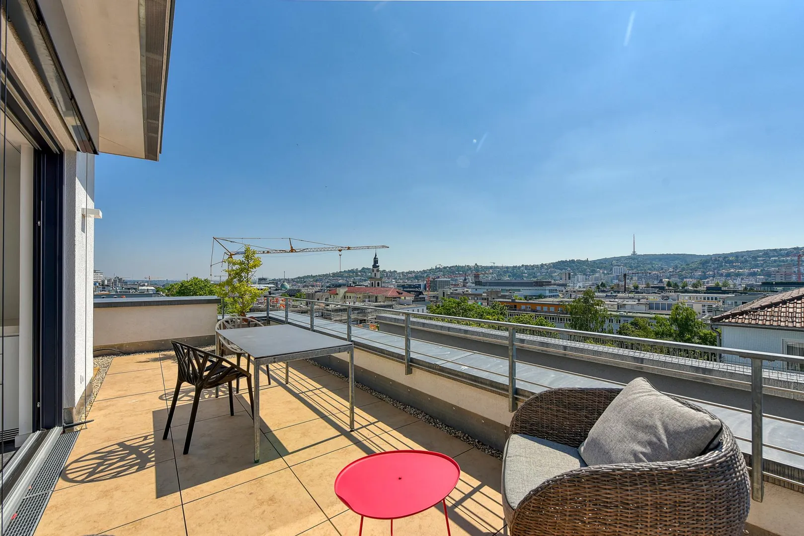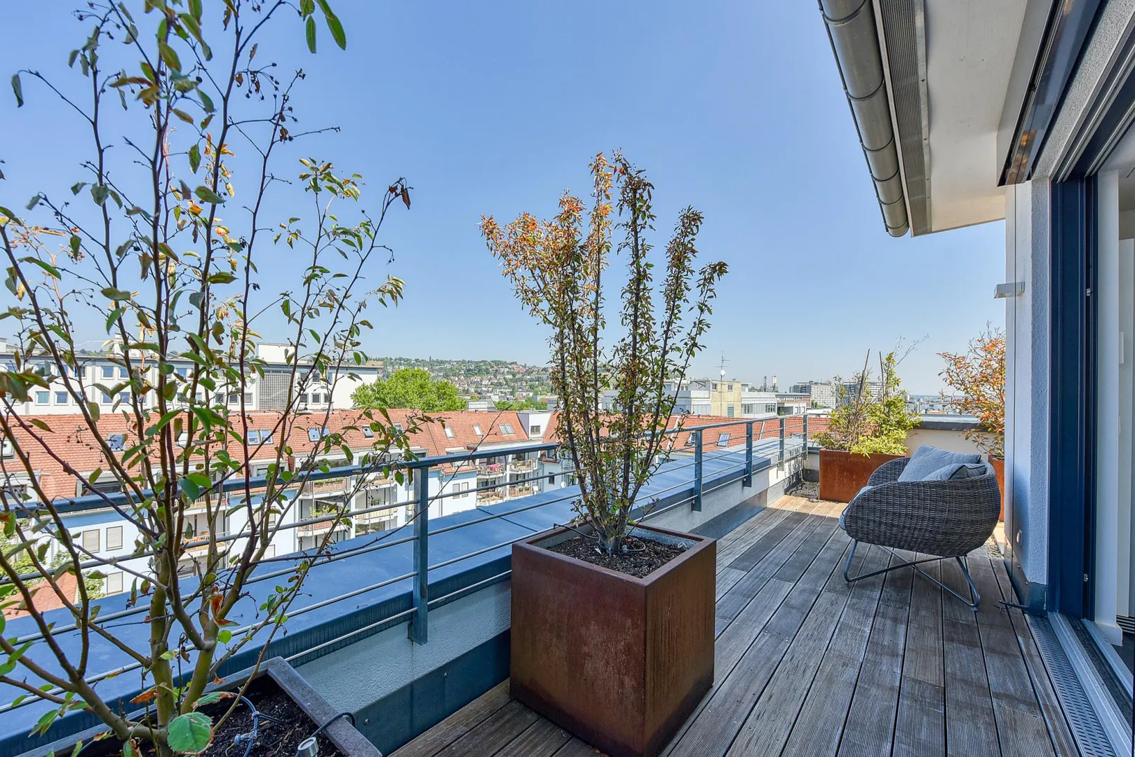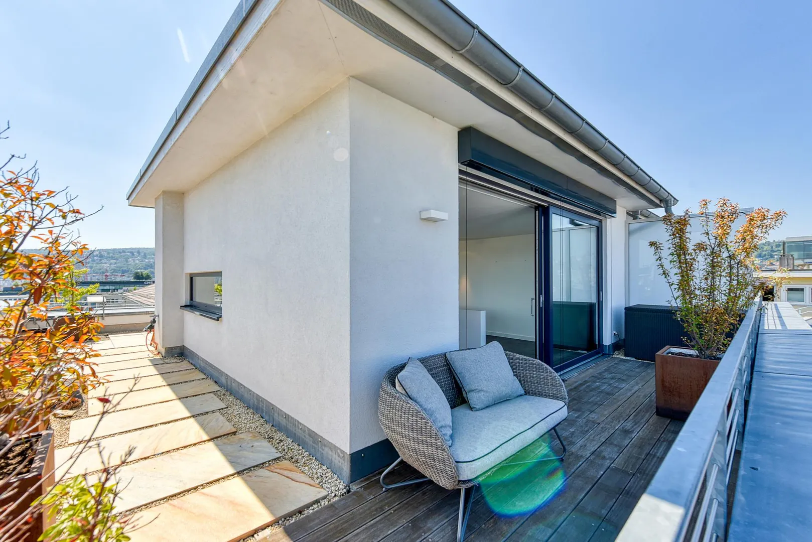 Die ca. 50 m² große Terrasse verteilt sich über drei Hausseiten und verfügt über einen traumhaften Fernblick.