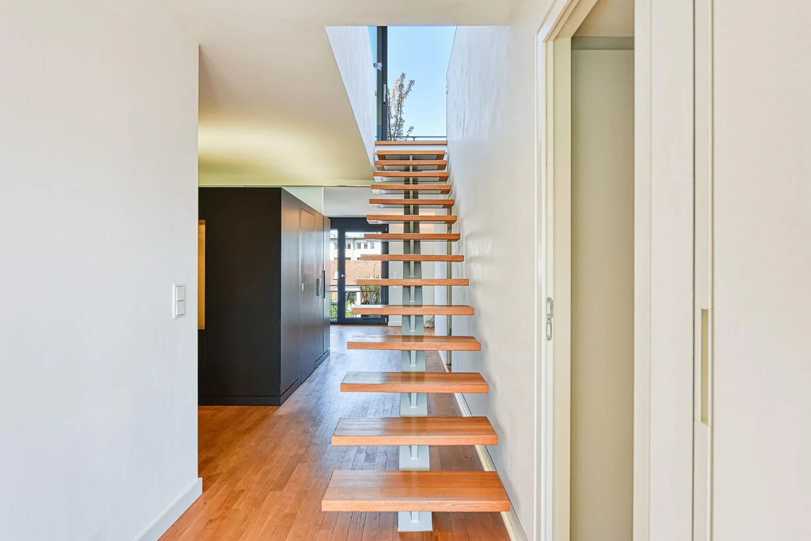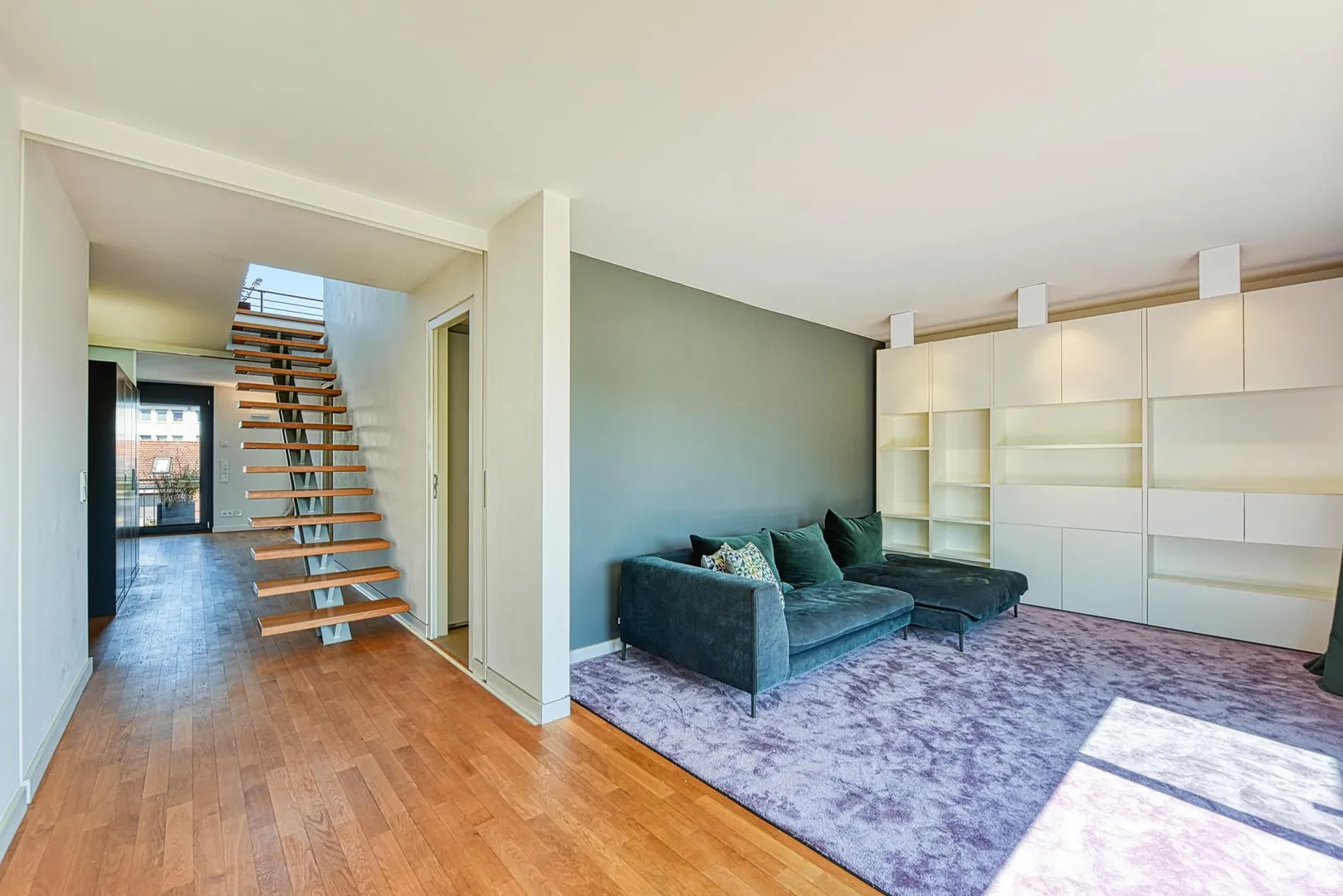 Zur Wohnung gehören ein kleiner Abstellraum im Erdgeschoss sowie zwei Kfz-Stellplätze im Doppelparker (Duplex).