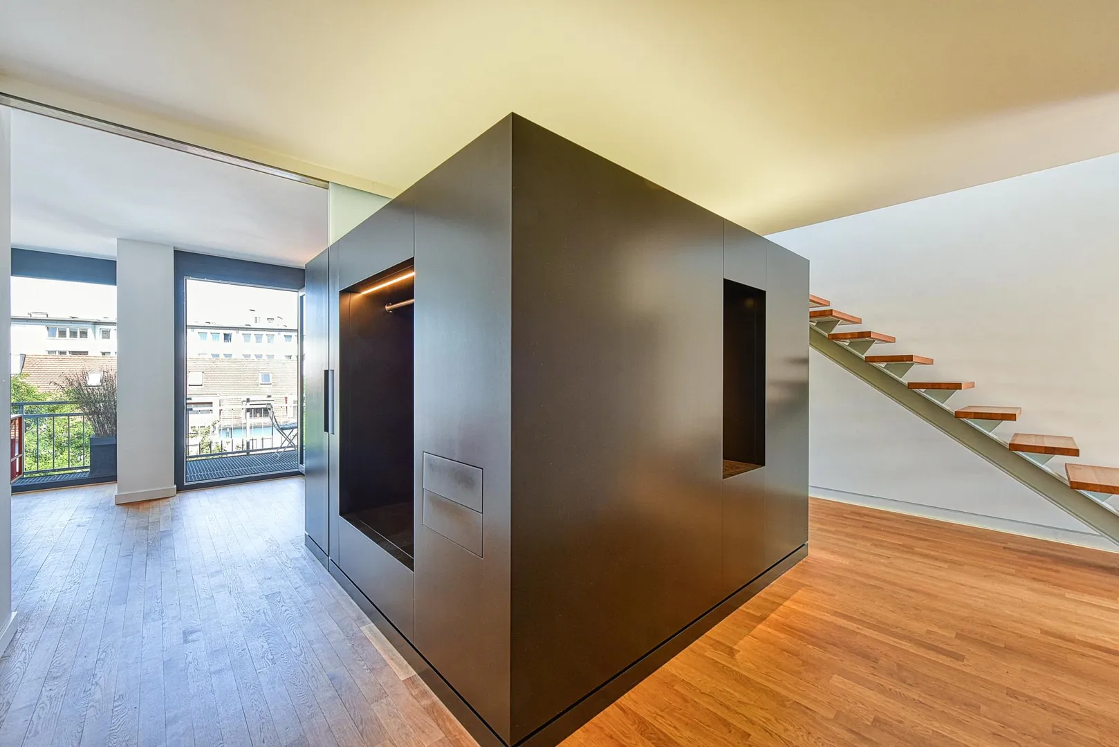 In der Diele befindet sich ein "Kubus", welcher als Garderobe und im Innenraum als begehbarer Schrank dient.