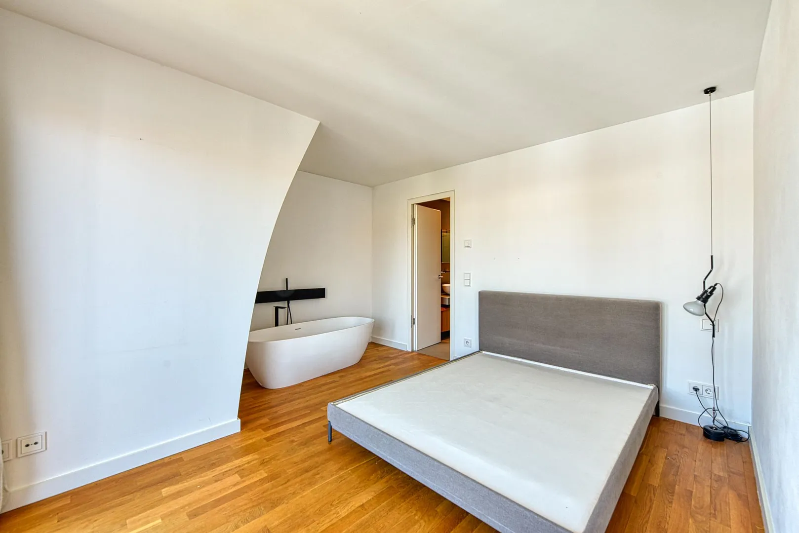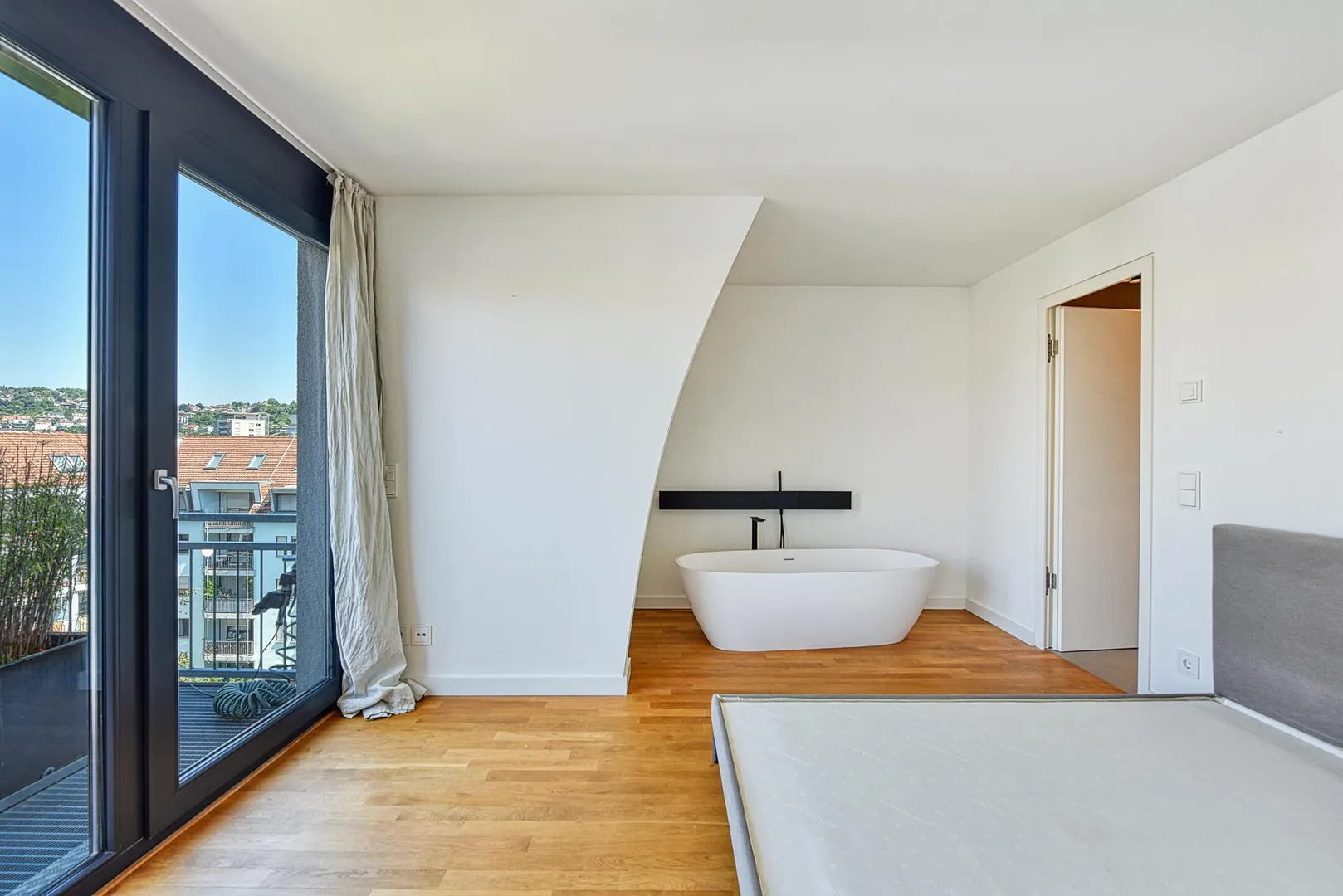 Im Schlafzimmer befindet sich eine freistehende Badewanne.