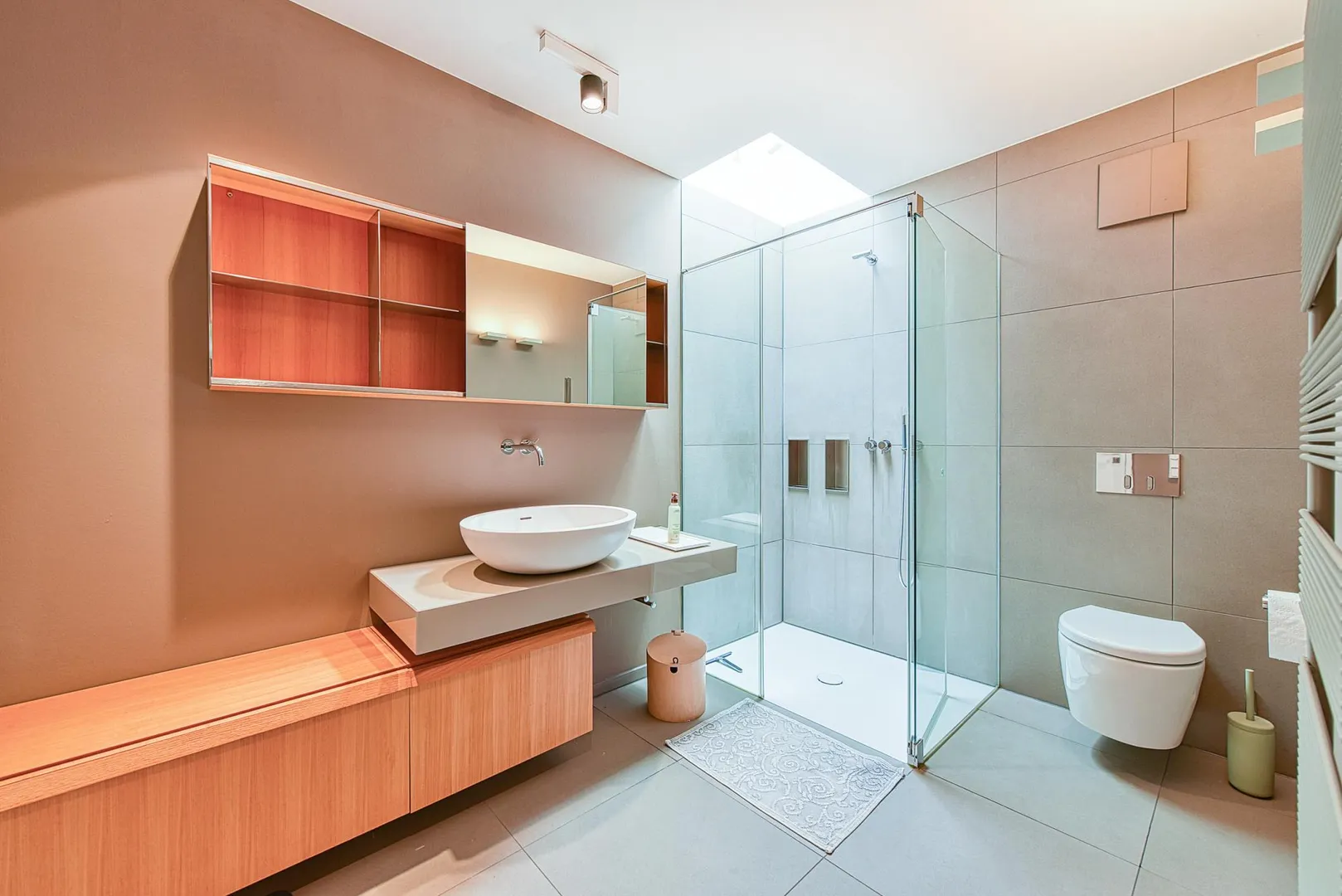 Das Bad en Suite verfügt über ein Oberfenster, eine bodentiefe Dusche, ein WC sowie einen begehbaren Kleiderschrank.