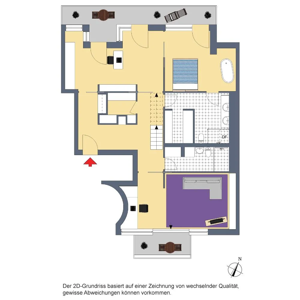 Über die ganze Nord/West-Seite geht ein Balkon, welche über drei Zugänge begehbar ist.