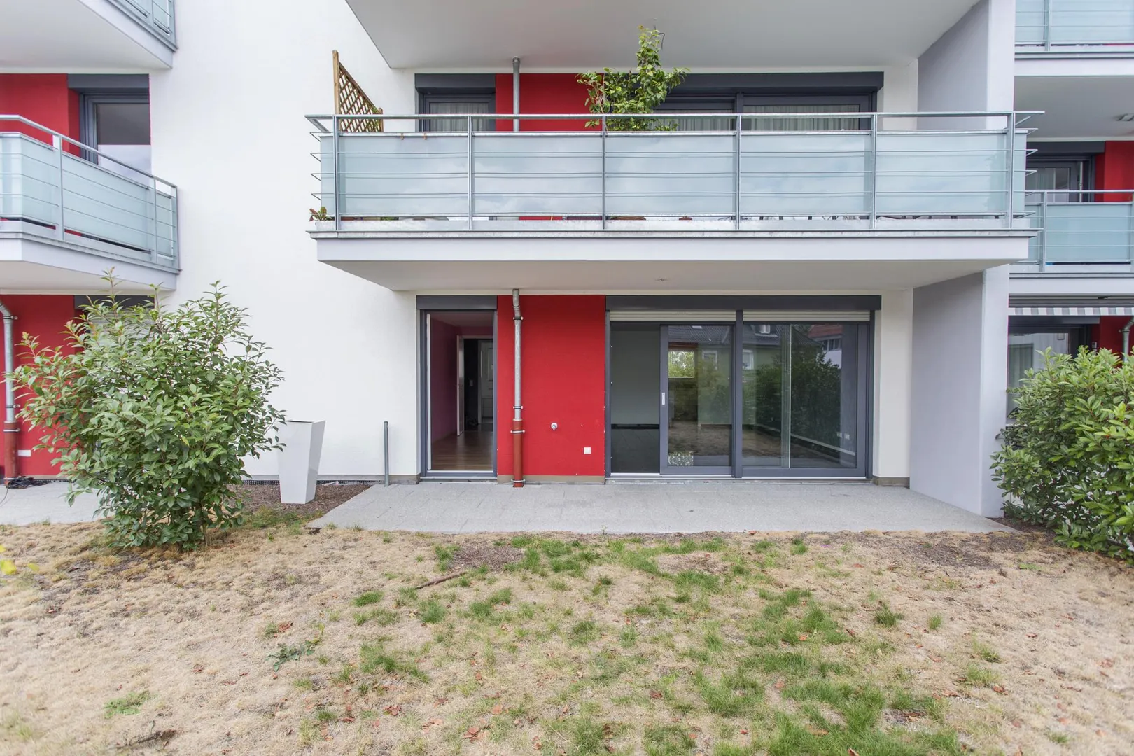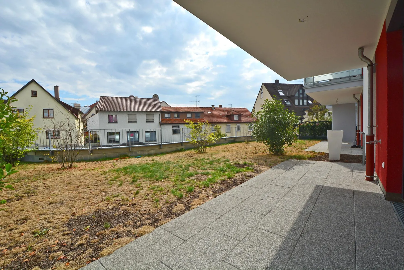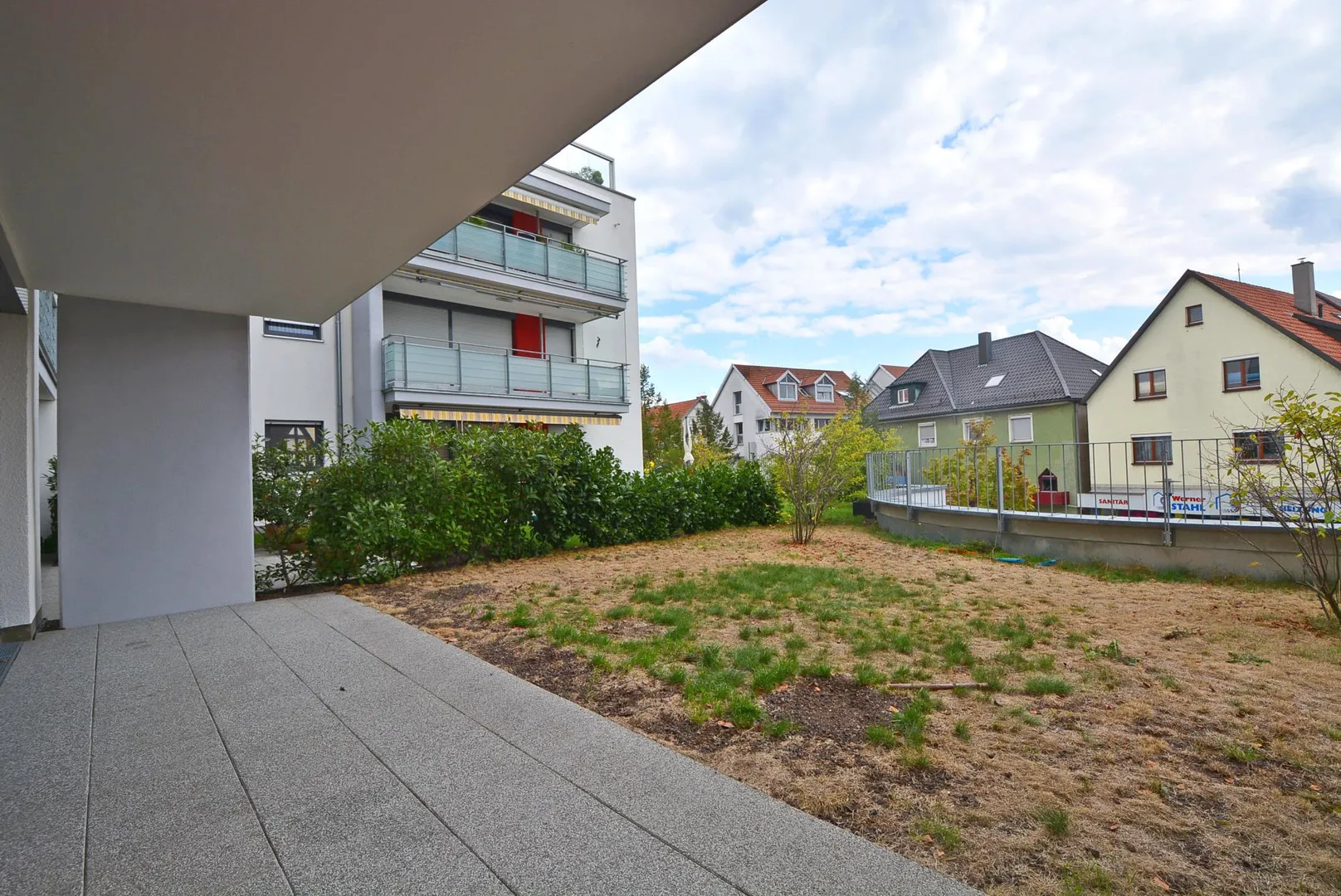 Die überdachte, ca. 12 m² große Terrasse mit einer angrenzenden, ca. 37 m² großen Grünfläche ist über das Wohn- und Arbeitszimmer begehbar und befindet sich auf dem Dach der Drogerie Rossmann.