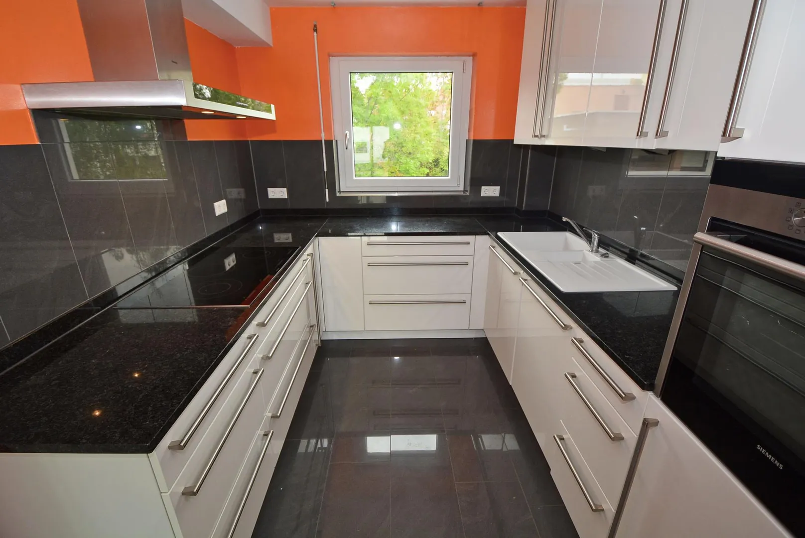 Die Küche ist mit einer Einbauküche sowie mit einem Außenabzug ausgestattet. Die Einbauküche mit weißen Hochglanzfronten beinhaltet einen Kühlschrank, einen Gefrierschrank, eine Spülmaschine, einen Ceran-Herd, einen Dunstabzug, einen Backofen sowie Unter- und Oberschränke.