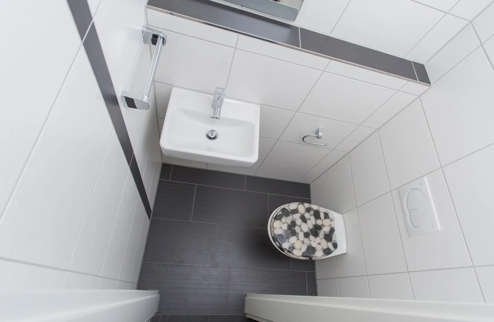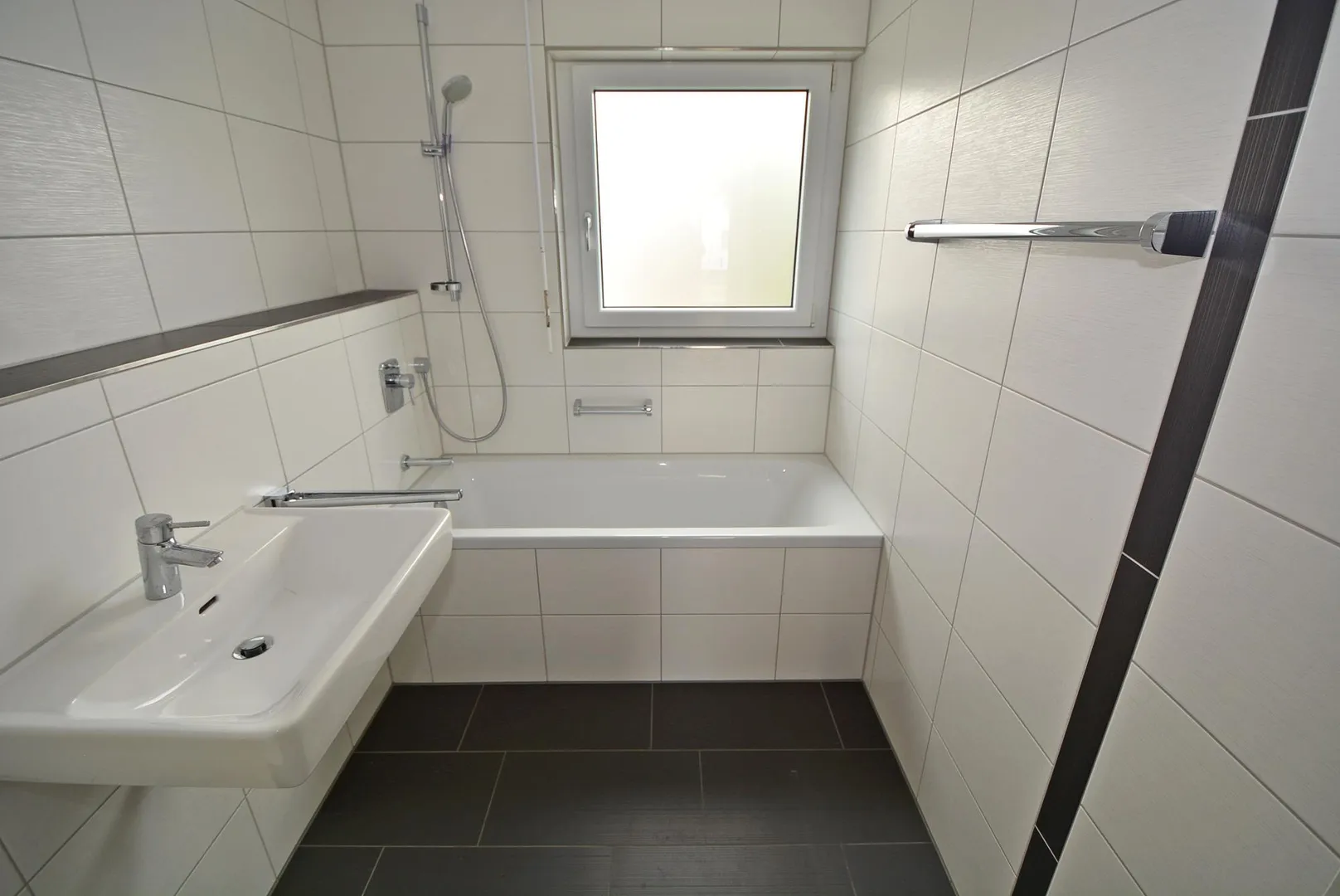Das raumhoch geflieste Badezimmer mit Fenster ist ausgestattet mit einer Badewanne mit einer Duschmöglichkeit sowie einem Waschbecken. Das geflieste WC ist separat. Die Küche ist über den offenen Wohn-/Essbereich begehbar.