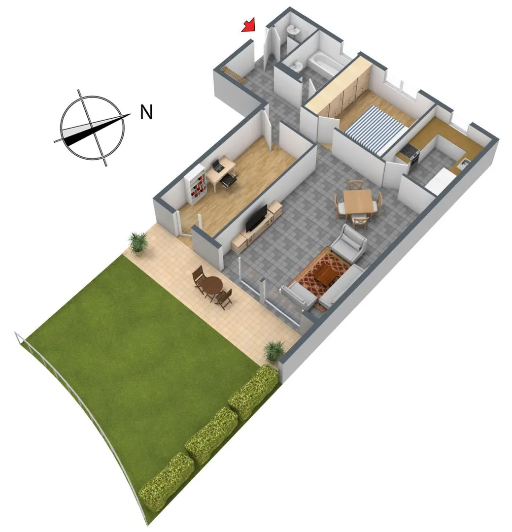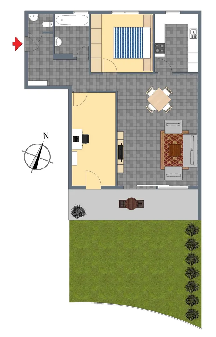Der offene Wohn-/Essbereich sowie das Arbeitszimmer sind nach Ost-Süd ausgerichtet. Das Badezimmer, das separate WC, das Schlafzimmer sowie die Küche sind nach Nord-West ausgerichtet.