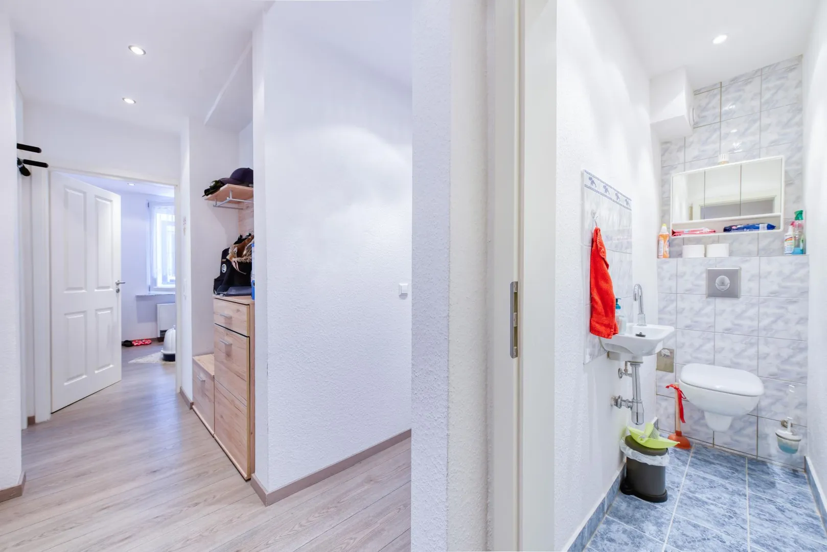 In den Zimmern und im Flur ist Laminat verlegt. Die Böden in der Küche, im Bad und im WC sind gefliest.