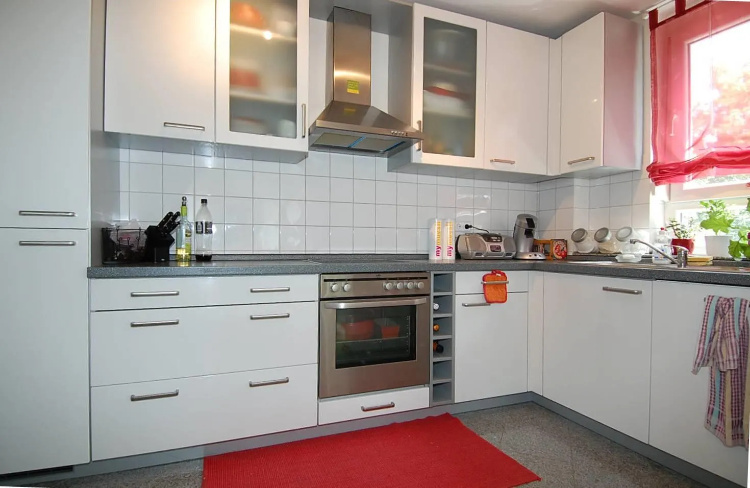 Die komplette Wohnung ist mit hellem Laminat ausgestattet. Das Gäste WC, die Küche und das Badezimmer ist mit hellen Granitsteinen versehen.