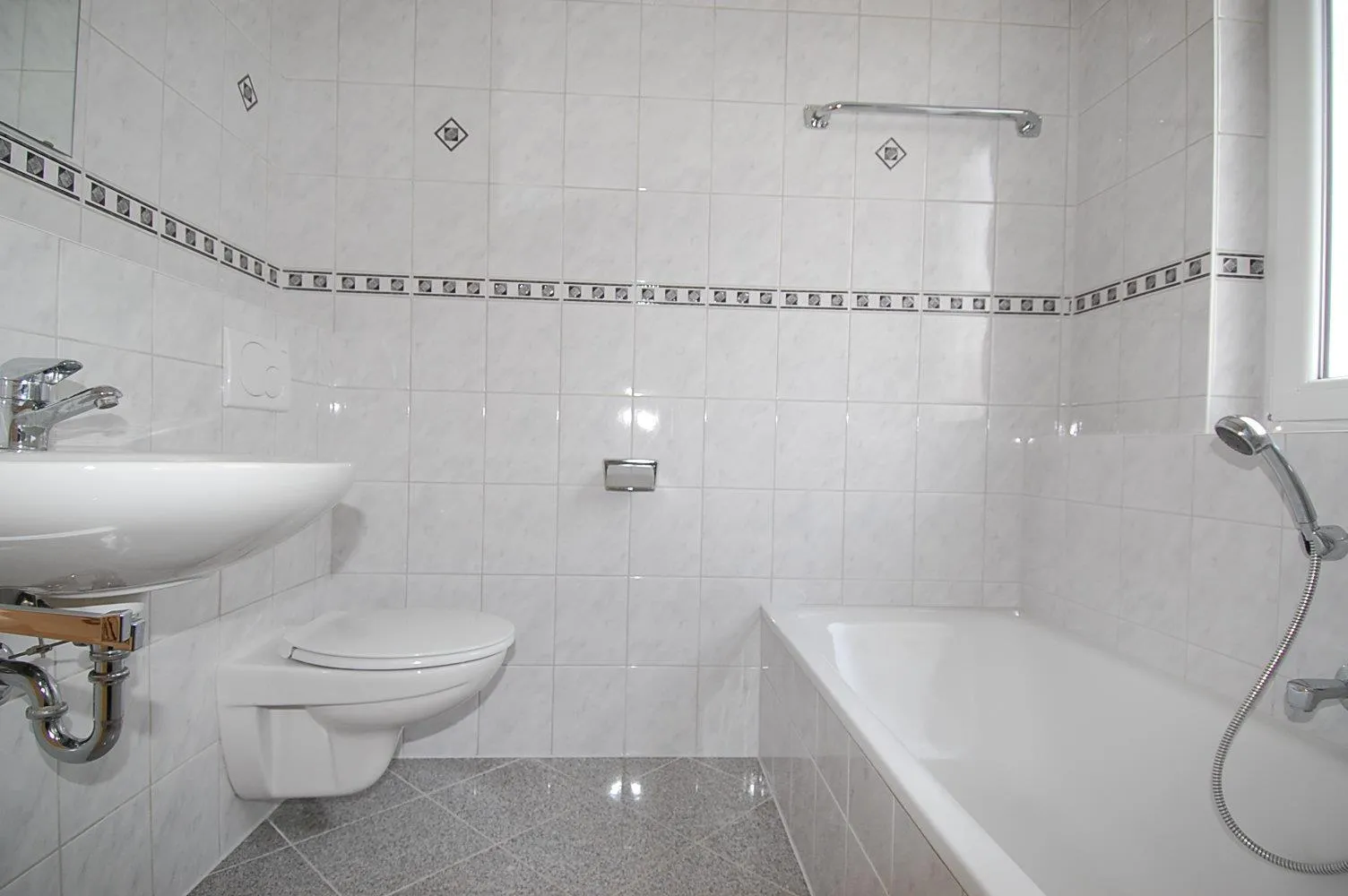 Das Tageslicht-Badezimmer ist ausgestattet mit einer Badewanne, Duschkabine, WC, einem Handtuchheizkörper und ist mit hellen Granitsteinen gefliest.