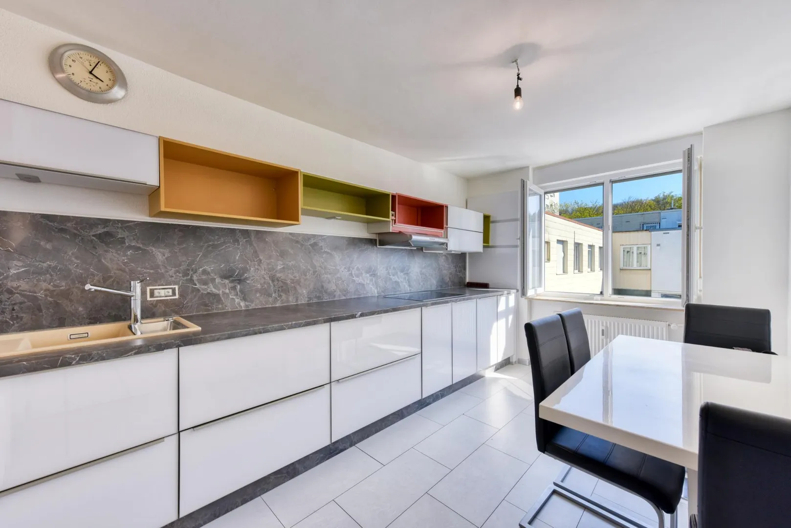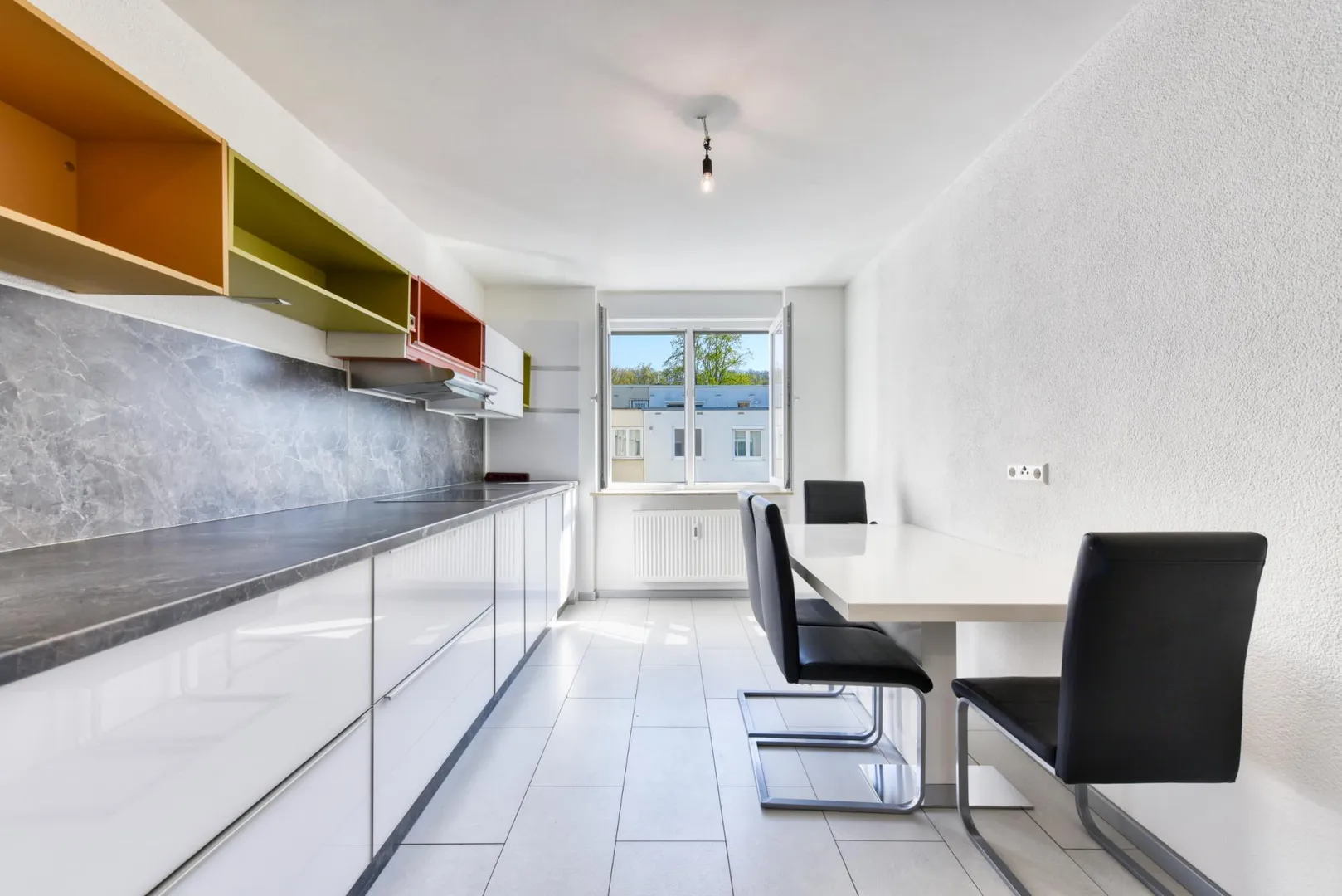 Die Wohnung ist hell: das Wohnzimmer, das Kinderzimmer sowie die Küche sind nach Süden ausgerichtet. Die Raumhöhen betragen ca. 2,49 Meter.