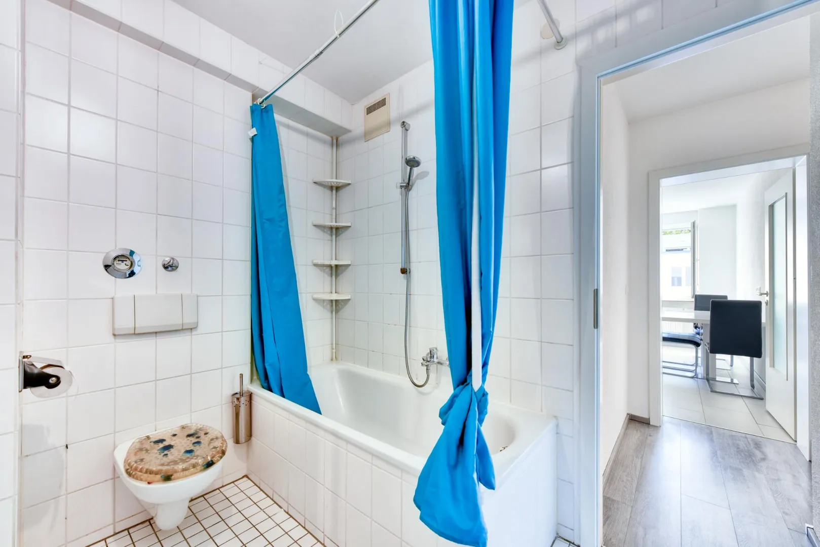 Das raumhoch geflieste Badezimmer ist ausgestattet mit einer Badewanne, einem WC sowie einem Waschmaschinen-Anschluss mit einem Kombi-Gerät.