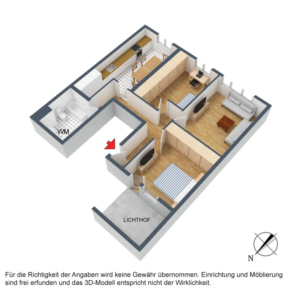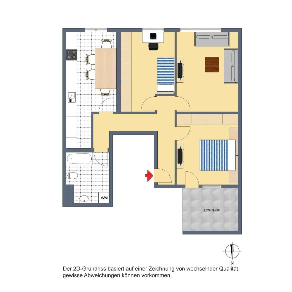 Der Grundriss ist gut: alle Räume sind direkt vom Flur begehbar. Der ca. 8 m² große Lichthof ist über das Schlafzimmer begehbar.