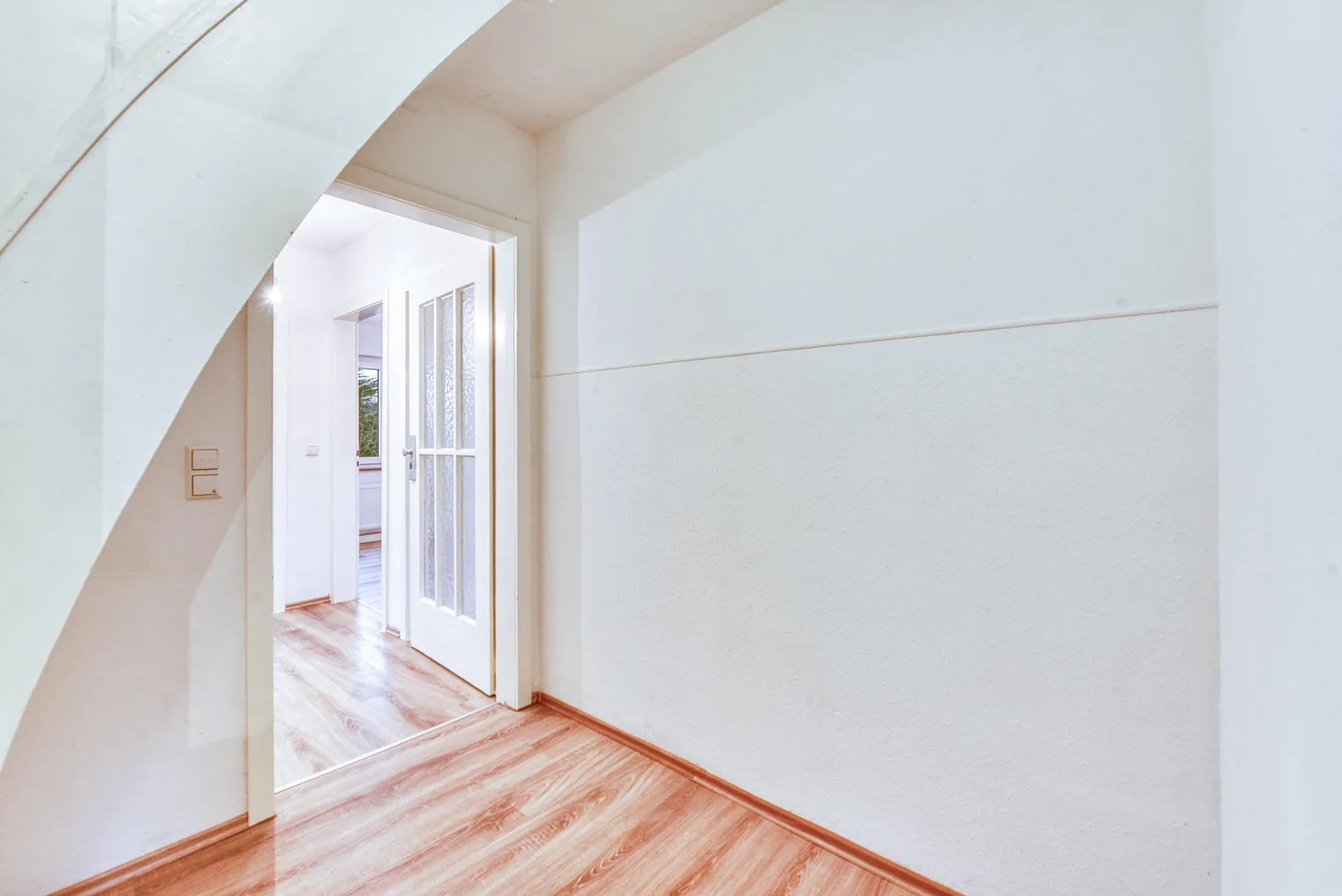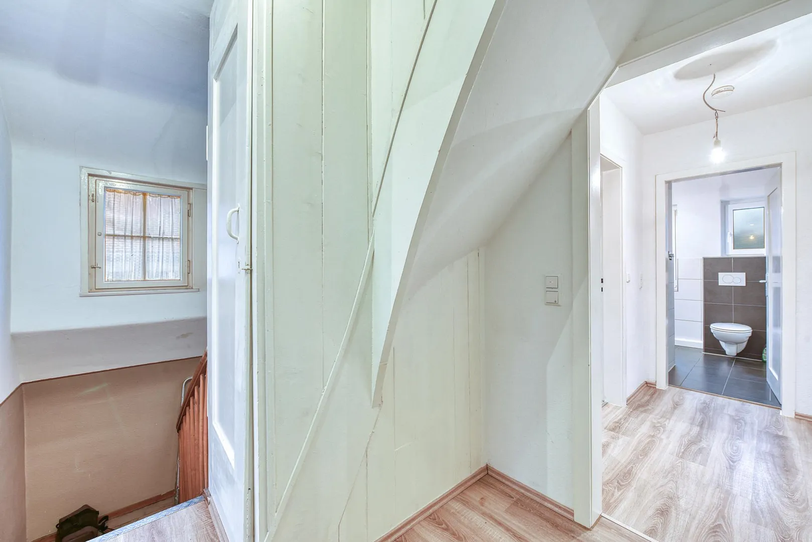 Die komplette Etage wird vermietet. Links vom Treppenhaus geht es in die 3-Zimmer-Wohnung, rechts vom Treppenhaus befindet sich das Arbeitszimmer.