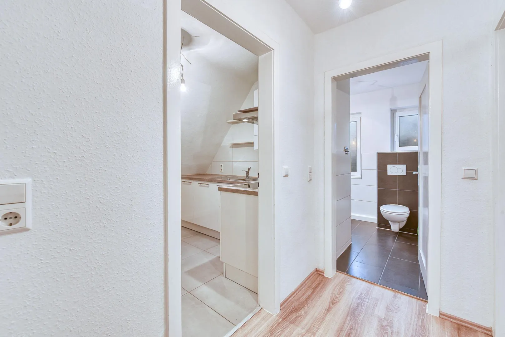Die Böden sind mit Laminat ausgestattet. Die Böden in der Küche sowie im Badezimmer sind gefliest.
