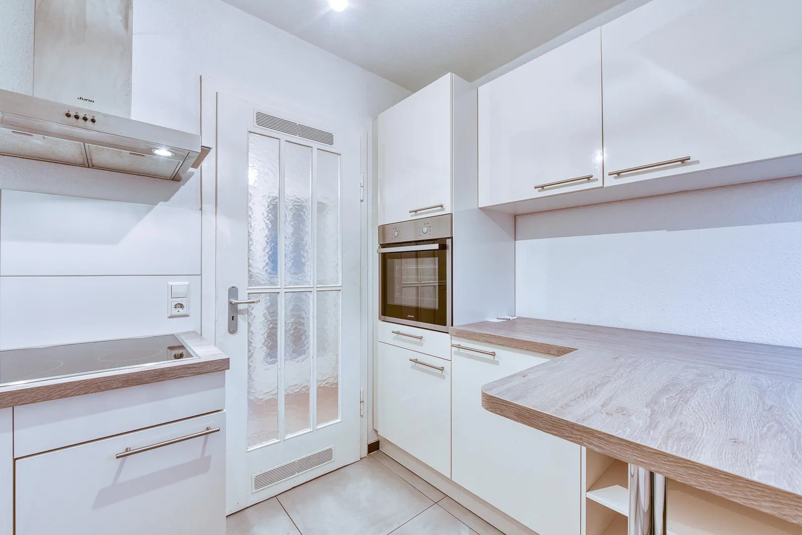 Die Küche ist ausgestattet mit einer Einbauküche. Die Elektro-Geräte sind funktionsfähig. Für die künftige Funktionsfähigkeit der E-Geräte haftet der Vermieter nicht.