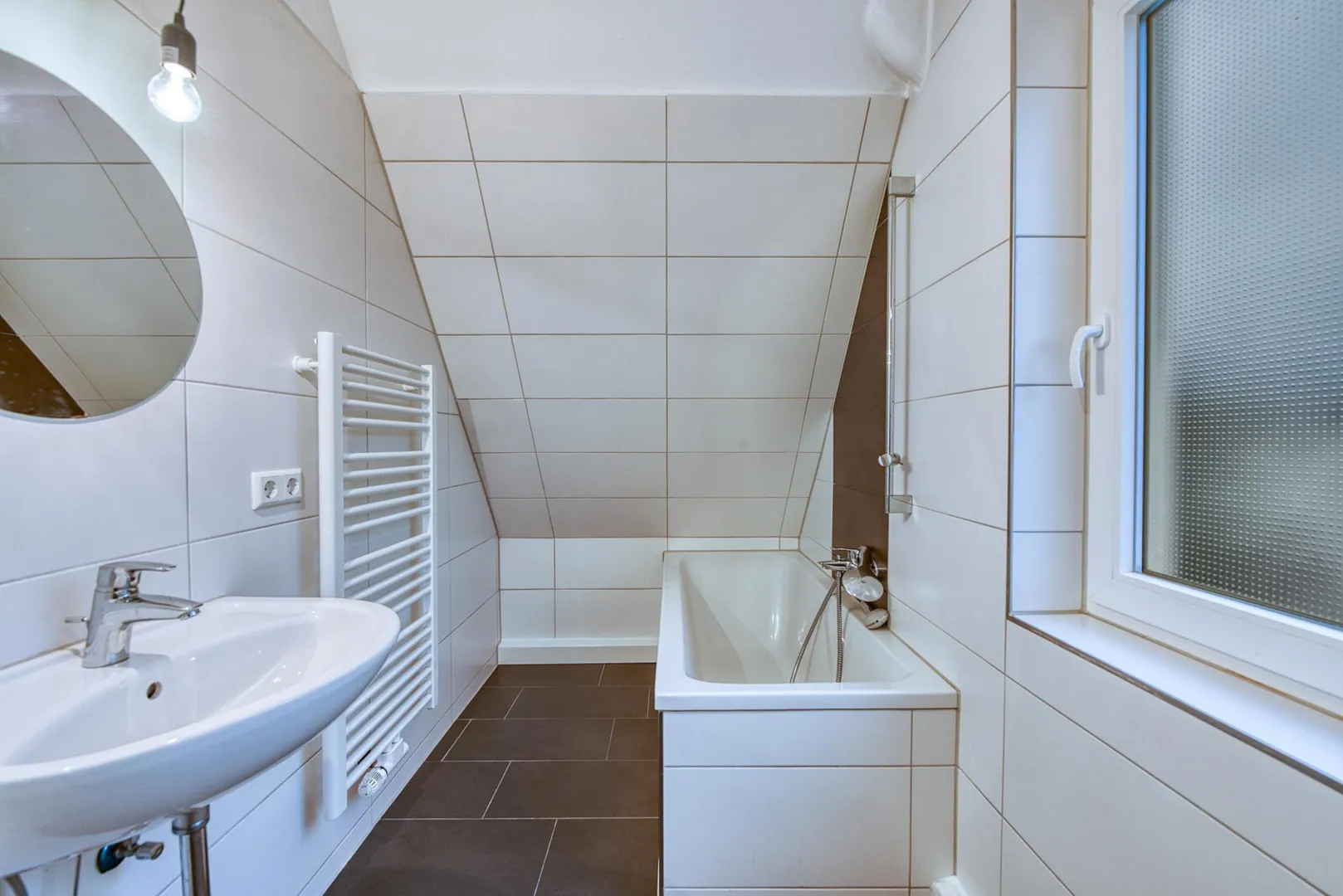 Das Tageslicht-Bad ist ausgestattet mit einer Badewanne, einem WC, einem Handtuch-Heizkörper sowie einem Spiegel.