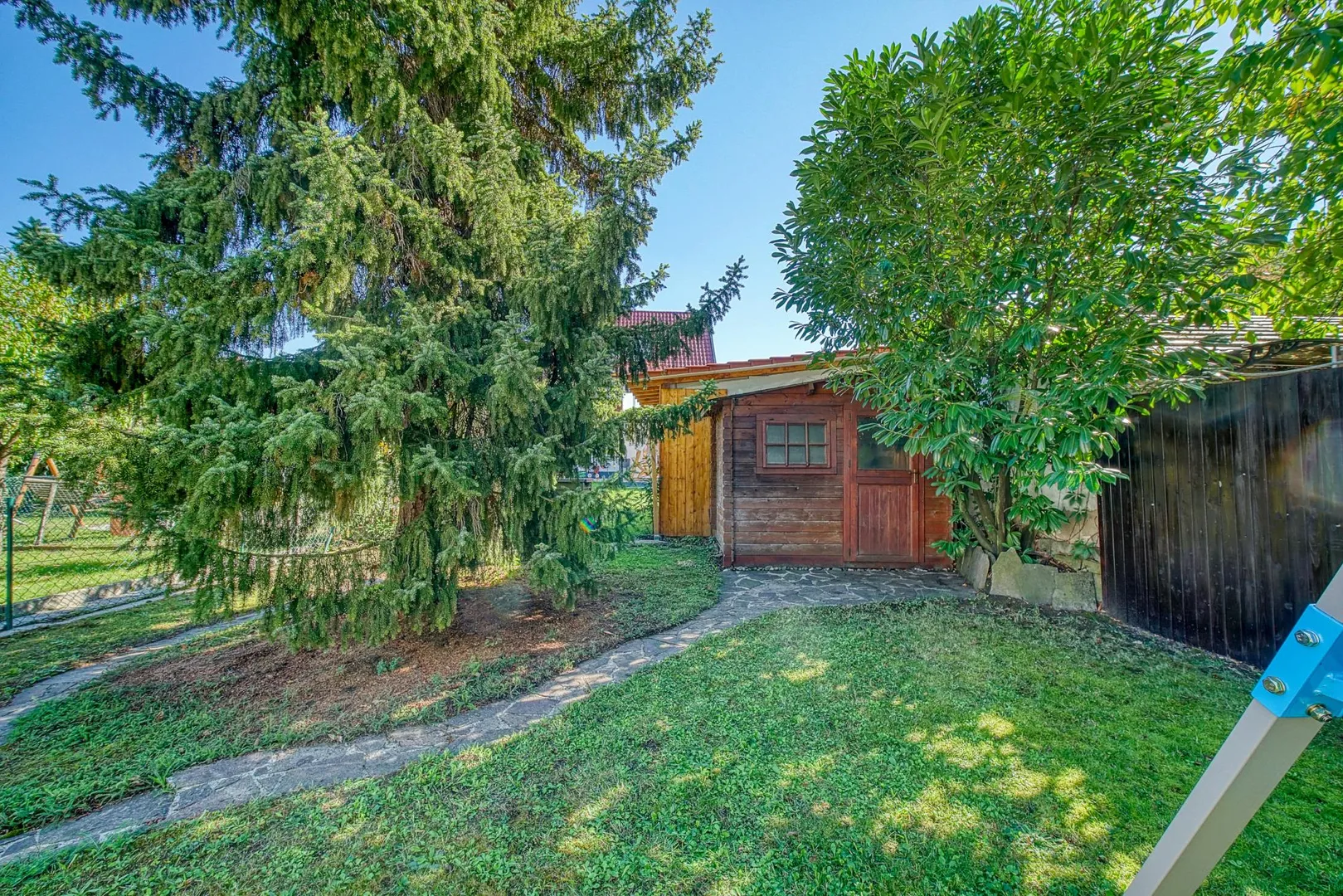 Auf dem Grundstück befinden sich im Außenbereich ein Kfz-Außenstellplatz, ein Hobbyhäusle (ehemals Garage) sowie ein Gartenhäusle.