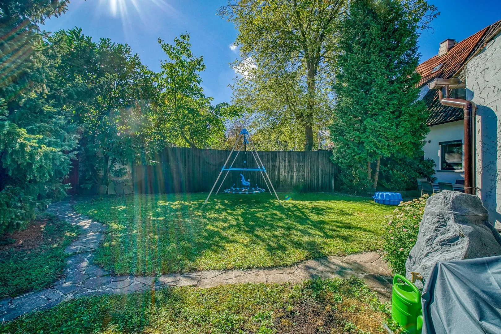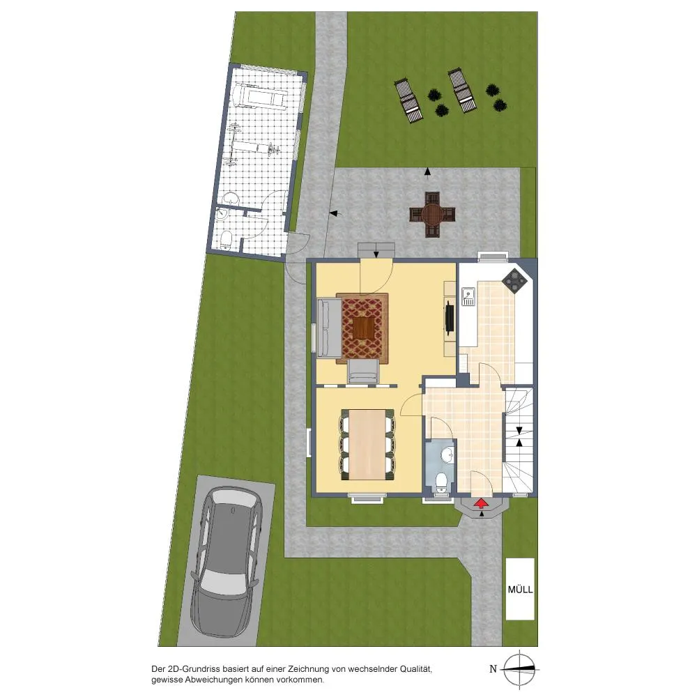 Das Grundstück ist trapezförmig, eben und nach Osten ausgerichtet. Die breitere Grundstücksfront mit dem Hauseingang befinden sich auf der Westseite.