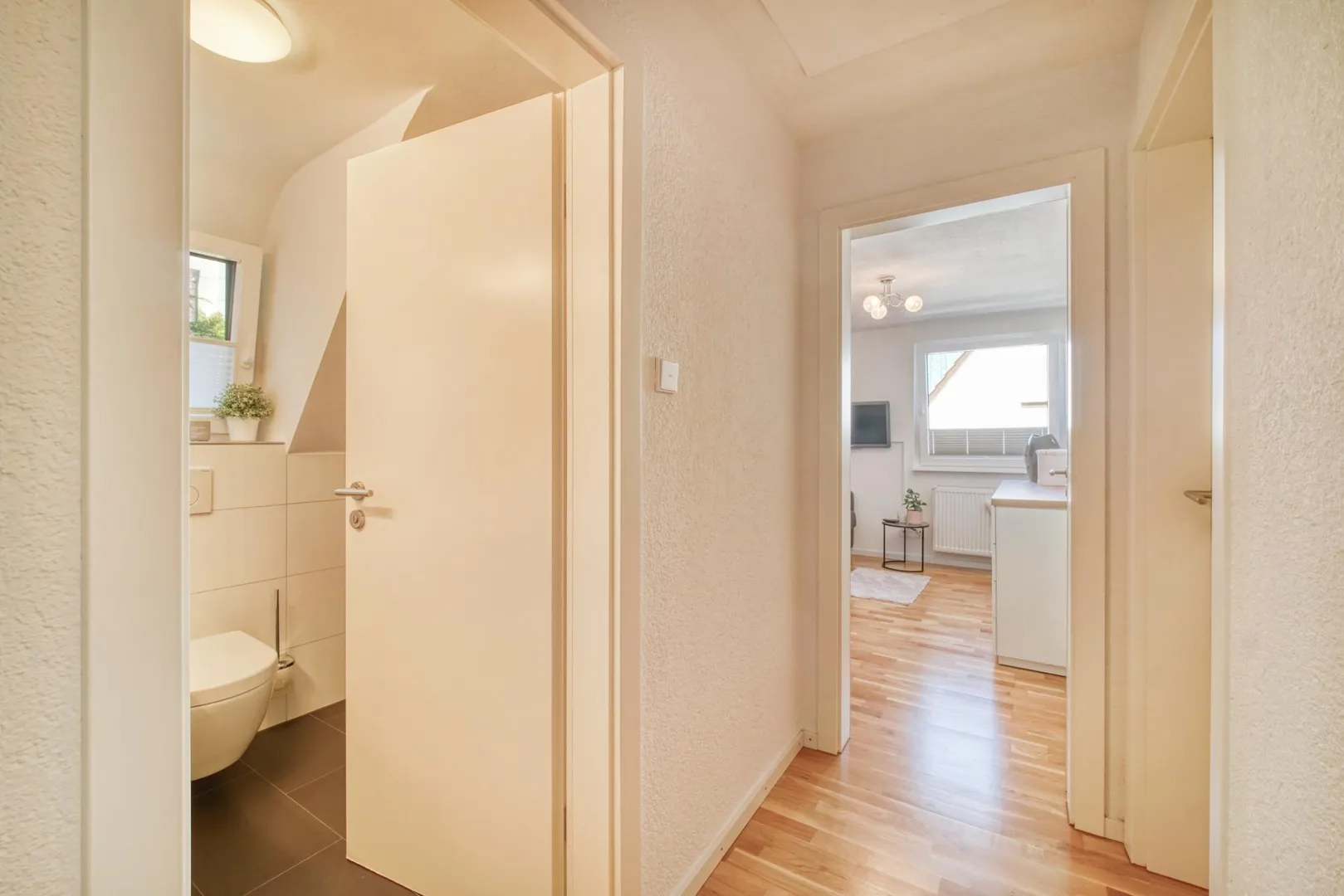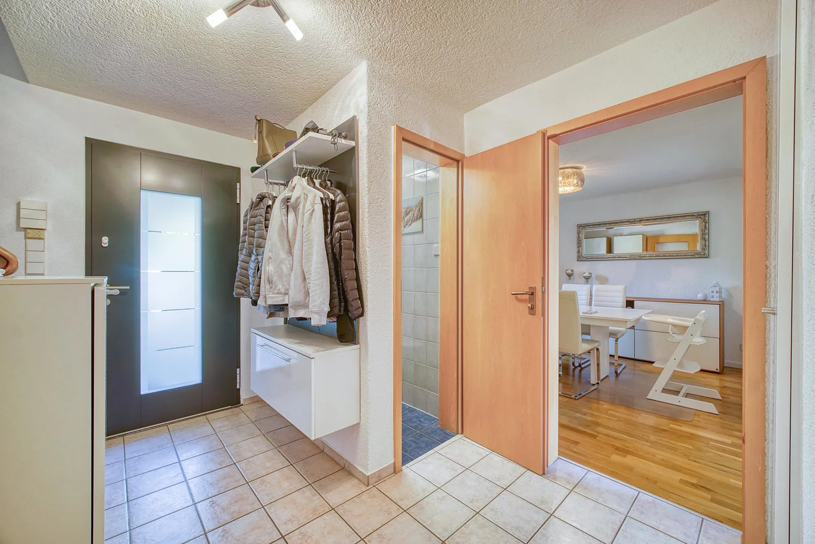 Die Böden in den Wohnräumen sind mit Parkett ausgestattet. Die Böden im Eingangsbereich, im WC, in der Küche sowie im Bad sind gefliest.