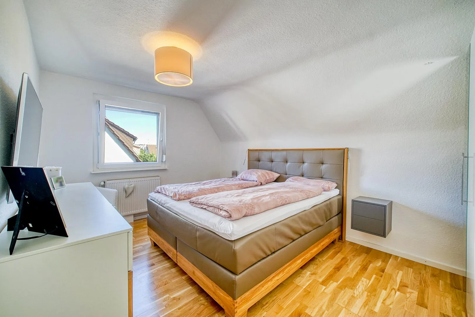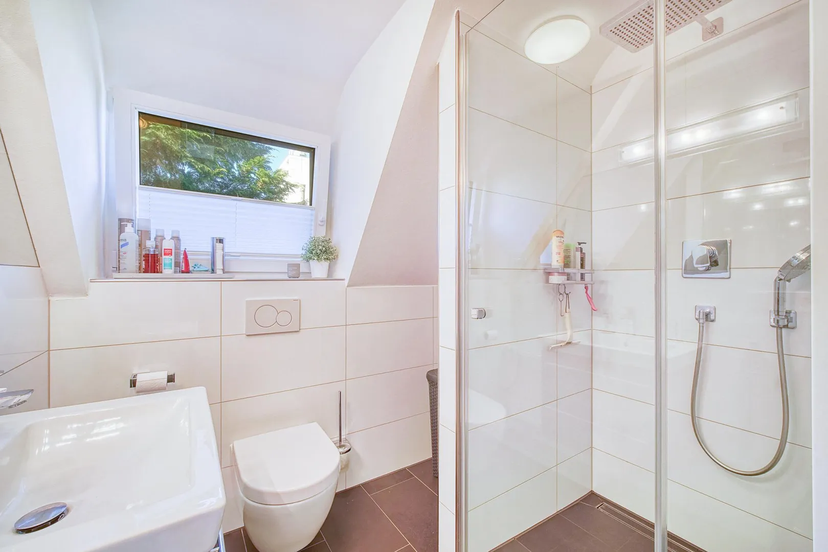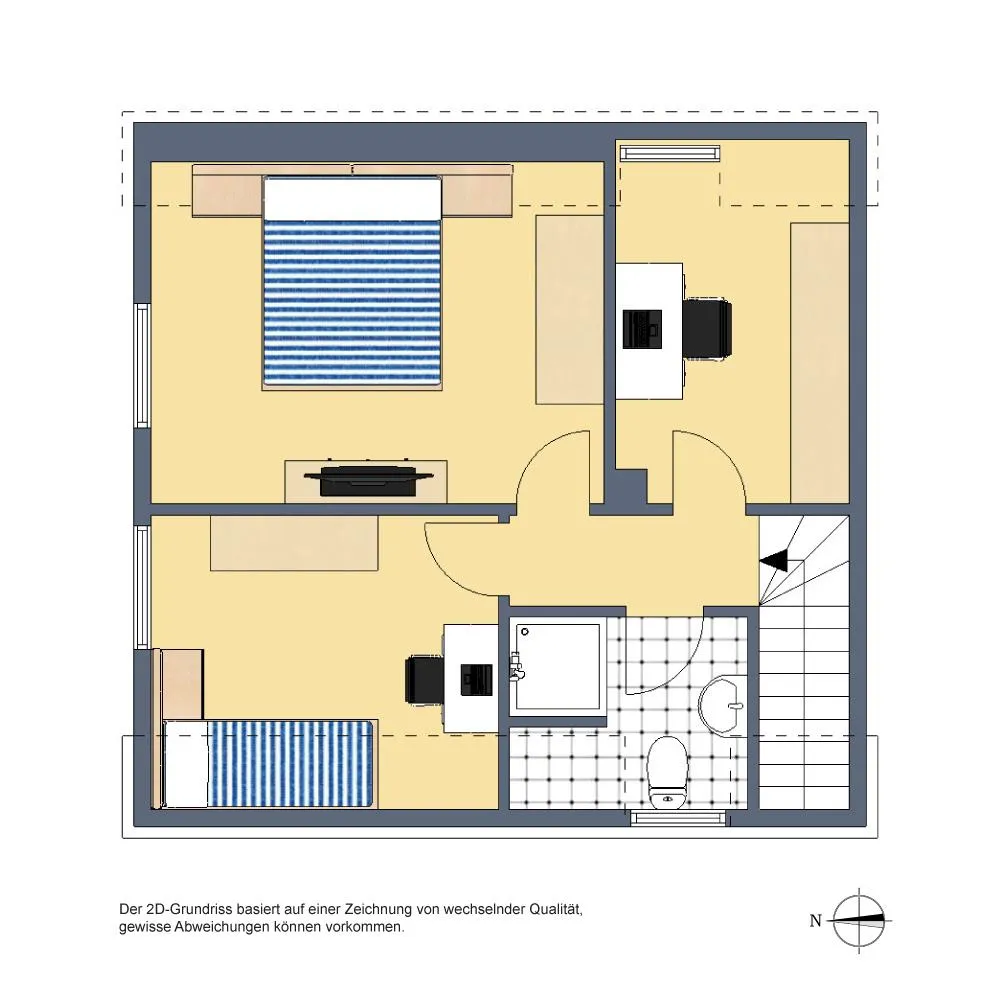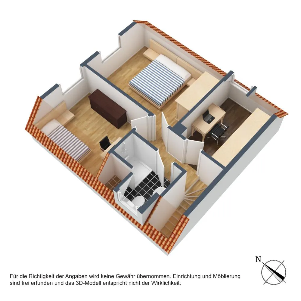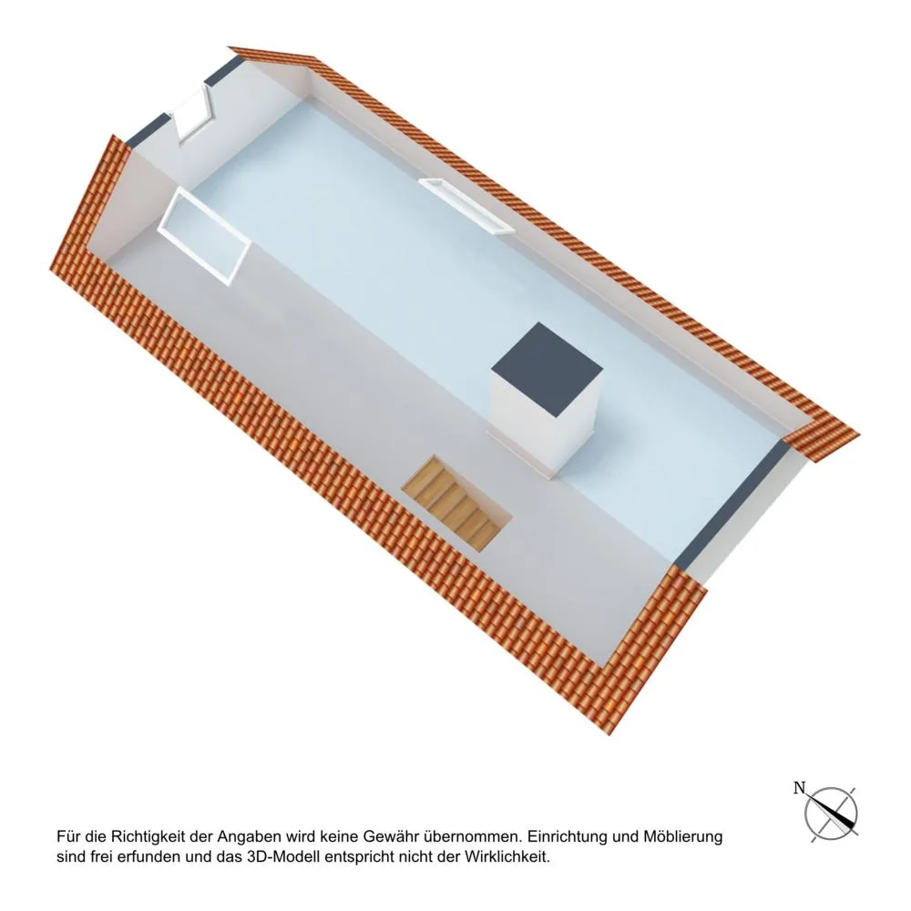 Im Dachgeschoss befinden sich auf ca. 35,9 m² befinden sich 3 Zimmer sowie das Tageslicht-Bad mit Dusche und WC. Die Raumhöhen betragen ca. 2,31 Meter.