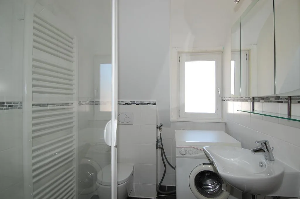 Das Tageslicht-Badezimmer wurde 2010 komplett modernisiert. Es ist halbhoch gefliest und verfügt über eine Dusche, einen Handtuchheizkörper, ein WC, ein Waschbecken mit Spiegelschrank sowie einen Waschmaschinenanschluss.