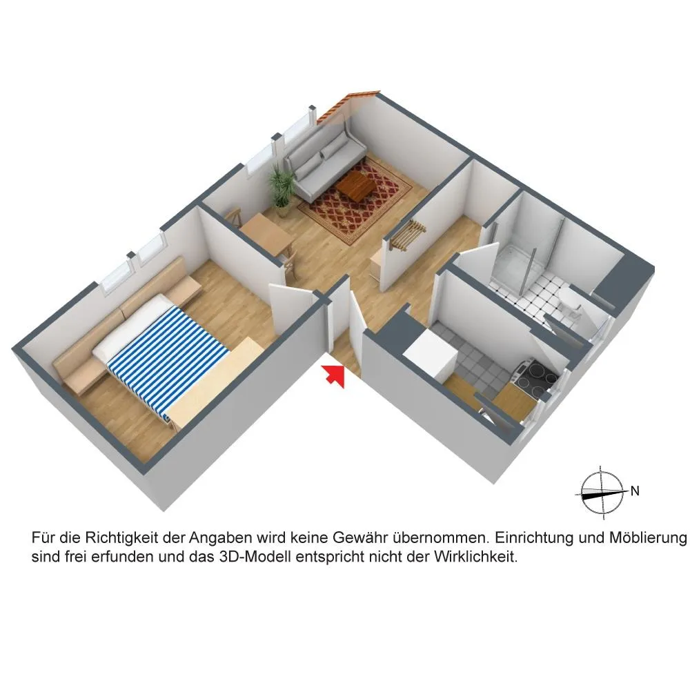 Über den Flur sind das Wohnzimmer, die Küche sowie das Tageslicht-Badezimmer begehbar. Das Schlafzimmer ist über das Wohnzimmer begehbar.