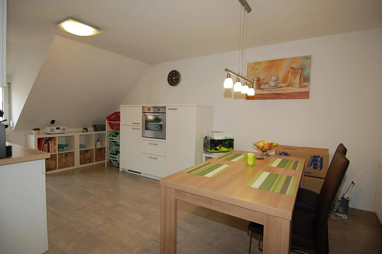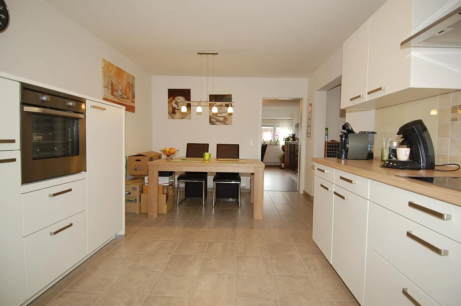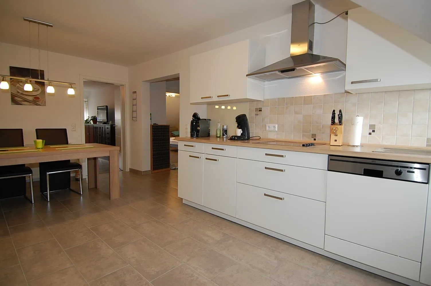 Der geräumige Küchen- und Essbereich ist mit Fliesenboden ausgestattet.