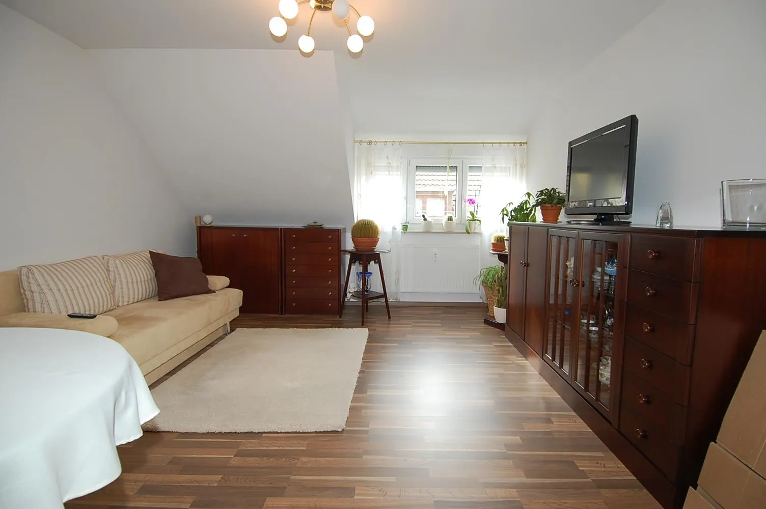 Die Wohnräume sind mit Raufaser tapeziert und mit Laminatboden ausgestattet.