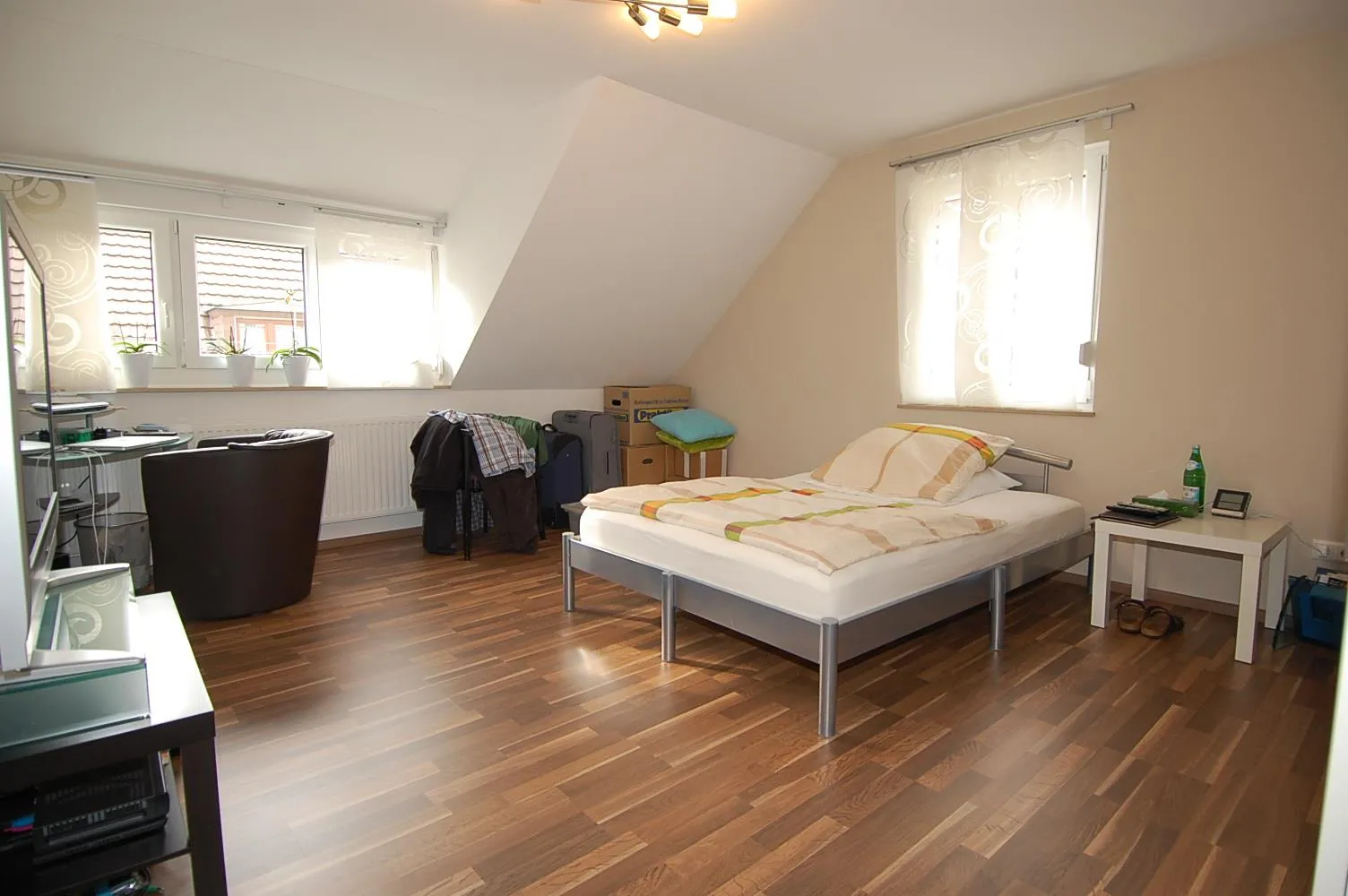 Das Wohnzimmer und das große Schlafzimmer sind nach Westen ausgerichtet, das dritte Zimmer (Arbeiten oder Kind) nach Osten.