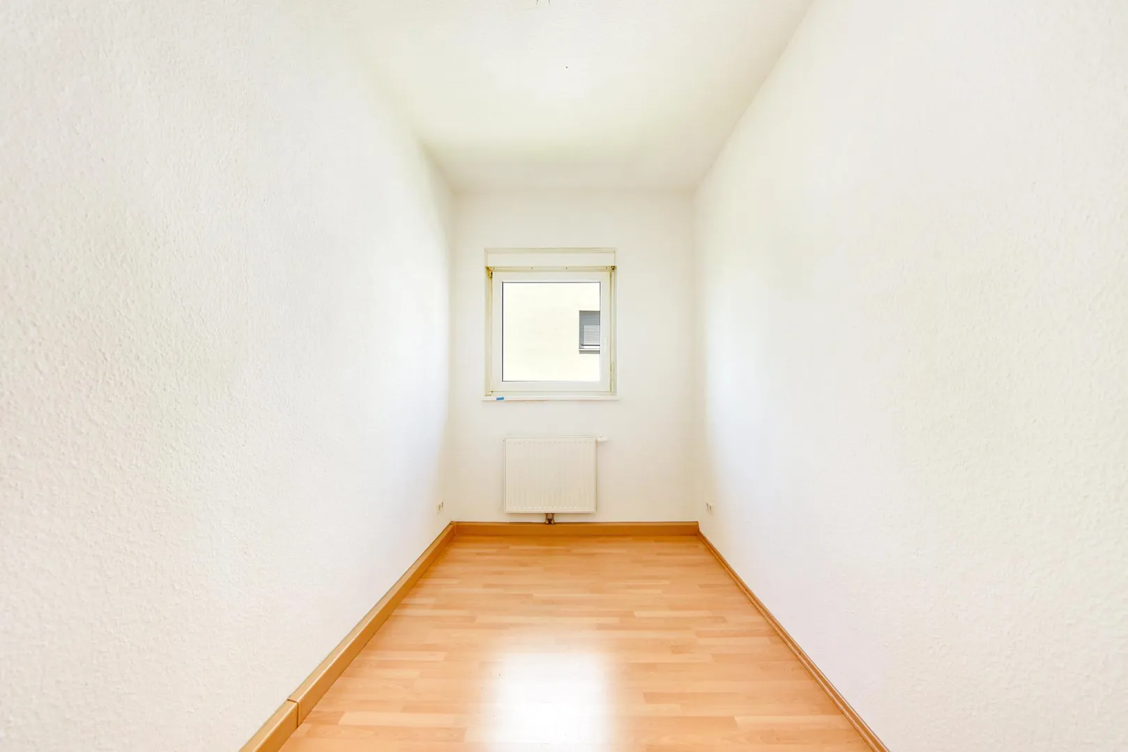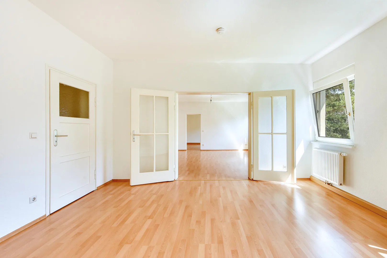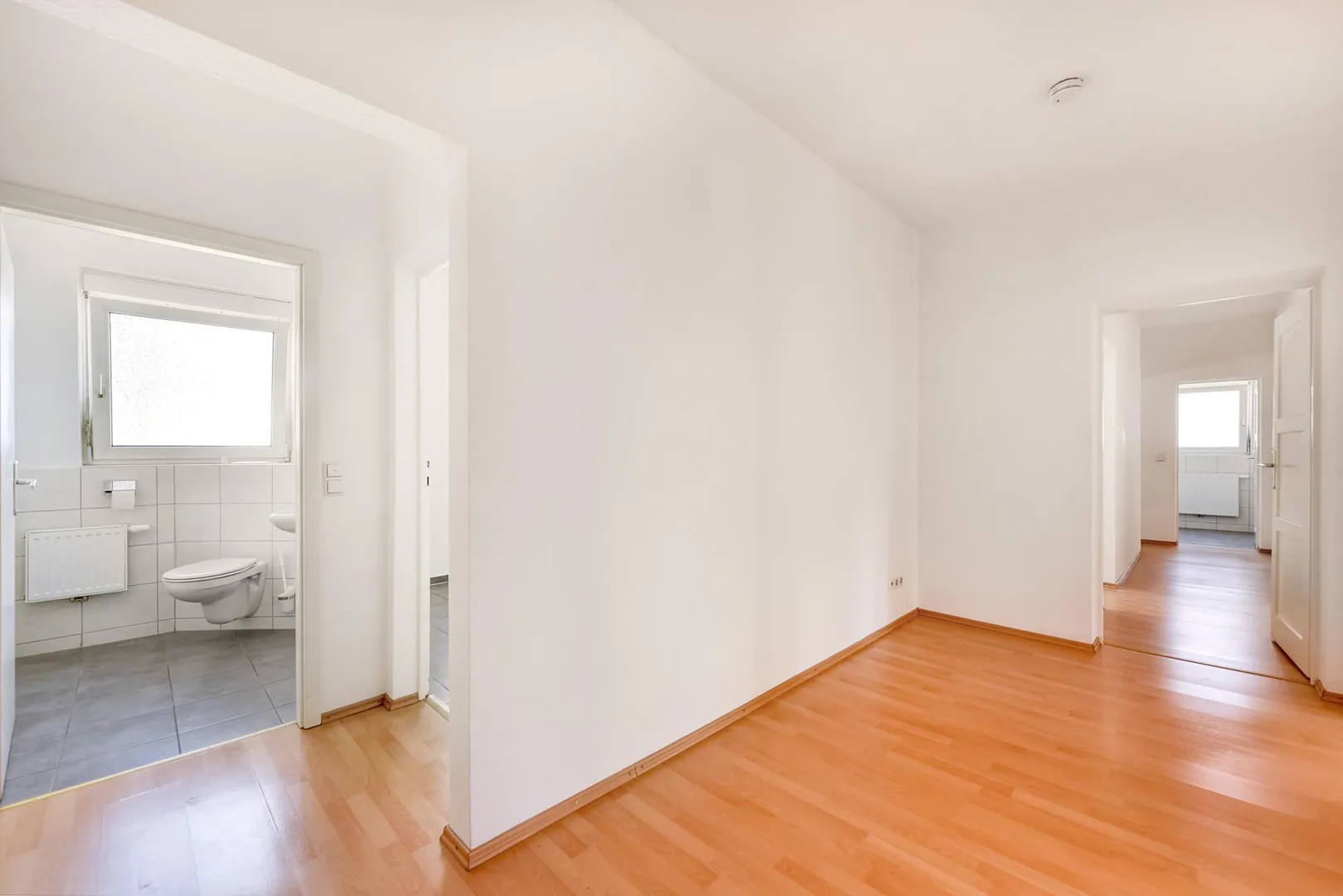 Die Wände sind überwiegend mit Raufasertapeten tapeziert und frisch, weiß gestrichen. Die Raumhöhen betragen ca. 2,77 Meter.